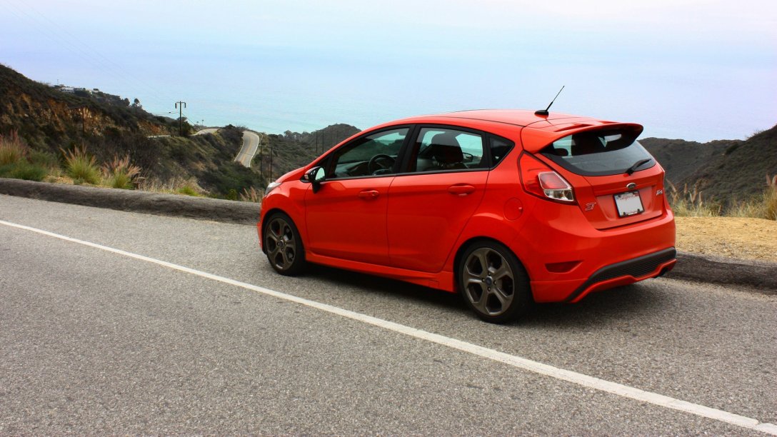 Through the morning, Fiesta’s brakes have had good stopping power and reassuringly firm pedal feel. However, the ST heavily relies on its brakes for torque vectoring (it lacks an LSD) and traction control, so even a run up a canyon can soak the brakes with heat. Thusly prewarmed on Mulholland, I am only halfway down Decker Road’s 1,600-foot descent when brake fade rears its ugly head. It’s mild fade; the pedal is still firm, but the car takes 10% or 20% longer to stop. When Decker finally terminates at the Coastal Hwy, twin plumes of smoke rise from the front wheels. Judging from the plumes’ thickness and the way passing drivers are staring, I suspect that the front brake pads are literally on fire. This isn’t the first ST product to suffer on Decker; the Focus ST also faded on this tortuous road. A relaxed cruise on the PCH cools the brakes. No damage is done; the smoked rims just look a little smokier!