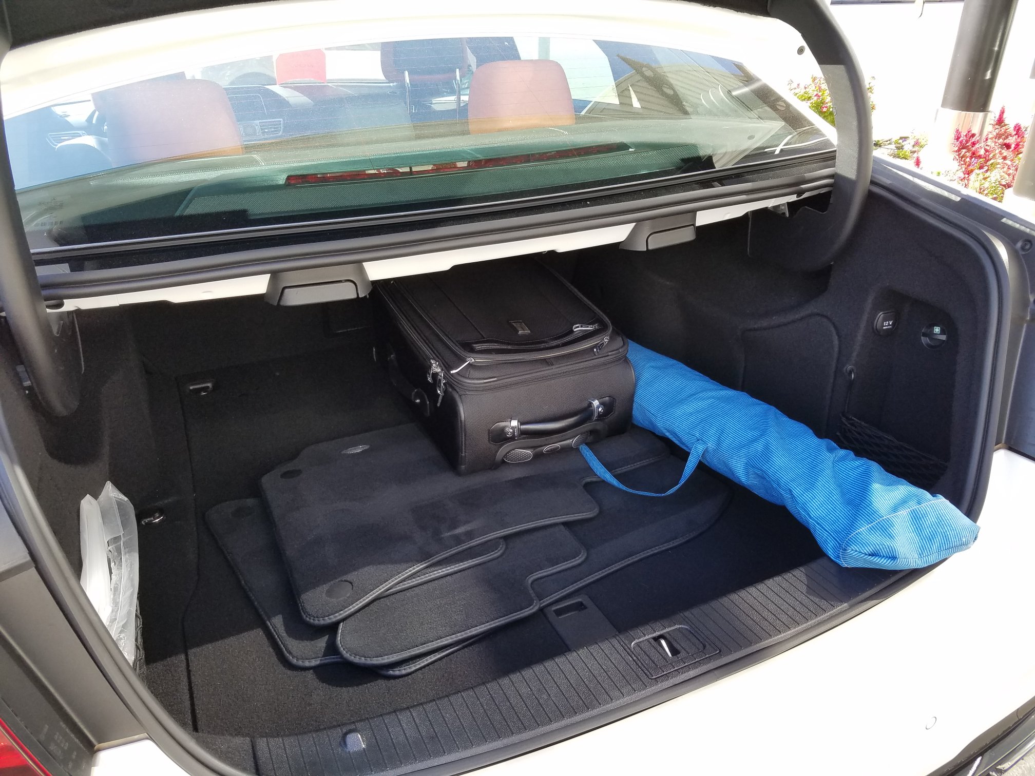 Last, I examine the E63’s trunk. Outside of a Crown Victoria or Lincoln Continental, I’m not sure I’ve seen a larger trunk in a sedan. The trunk’s interior is impressively regular in shape, it doesn’t taper much in width or height as you move into its depth, so it is effortless to load with suitcases. It also appears deep enough to accommodate two rollaboard bags lying head-to-toe and tall enough for two of the same bags to be stacked on each other. So long as the luggage is regular in shape, family trips should be a breeze.