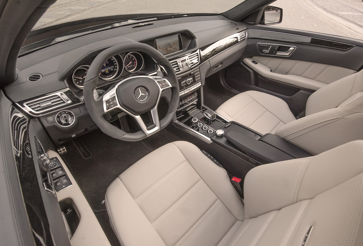 I start up the E63, and the engine immediately emits a satisfying blurt. “I see you’re smiling already,” says the salesman from the right seat. He is right; this monster AMG V8 is the kind of motor I want in my next car. With the S package, it makes a mad 577 hp and 590 ft-lbs of torque. AWD is standard so that the rear tires actually stand a chance. This should be a fun trip around the block.