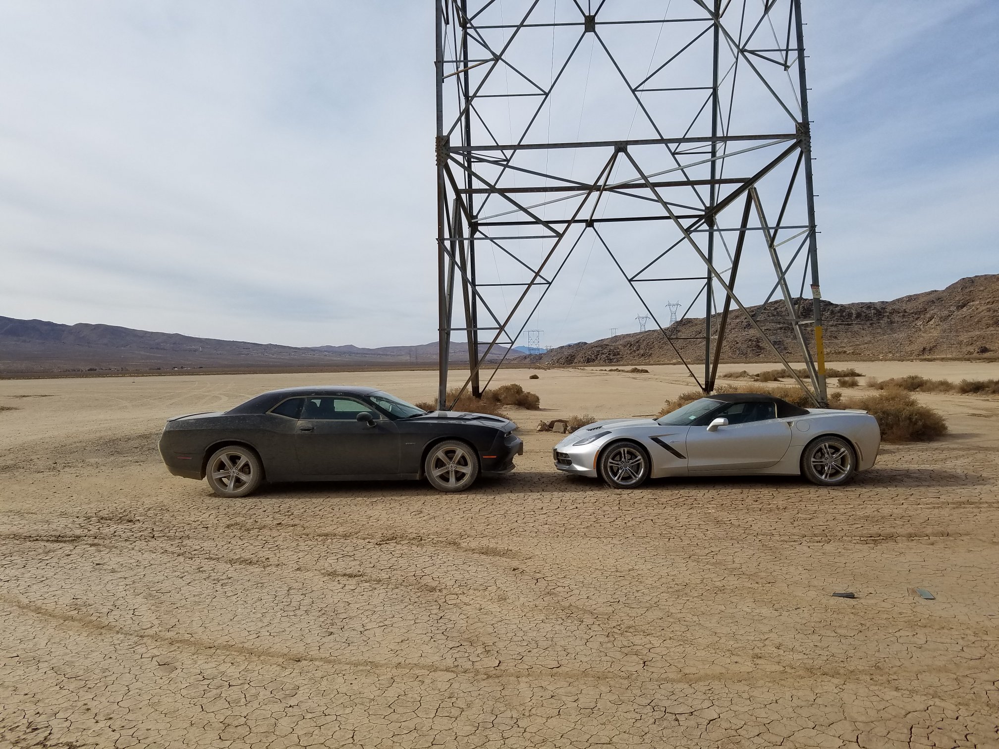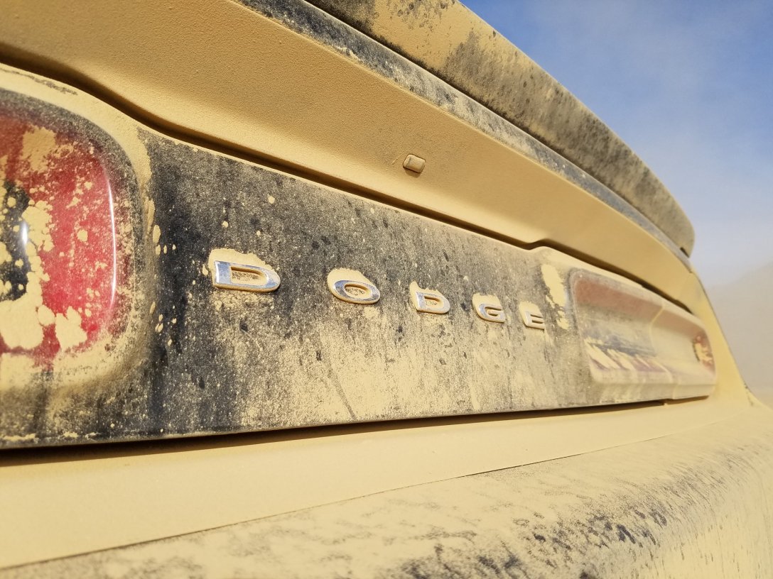 It does not take long for hooligan shenanigans to start. Within minutes Sage and I are drifting, skidding, and practicing J-turns on the desert playground. The flat, cracked-earth lakebed is quickly sketched with parallel lines and twisted squiggles. Our once-clean cars are powdered in brown, silty soil. (The lingering spirit of Jeremy Clarkson inspires one of us to draw a phallus on the dirty Challenger.)