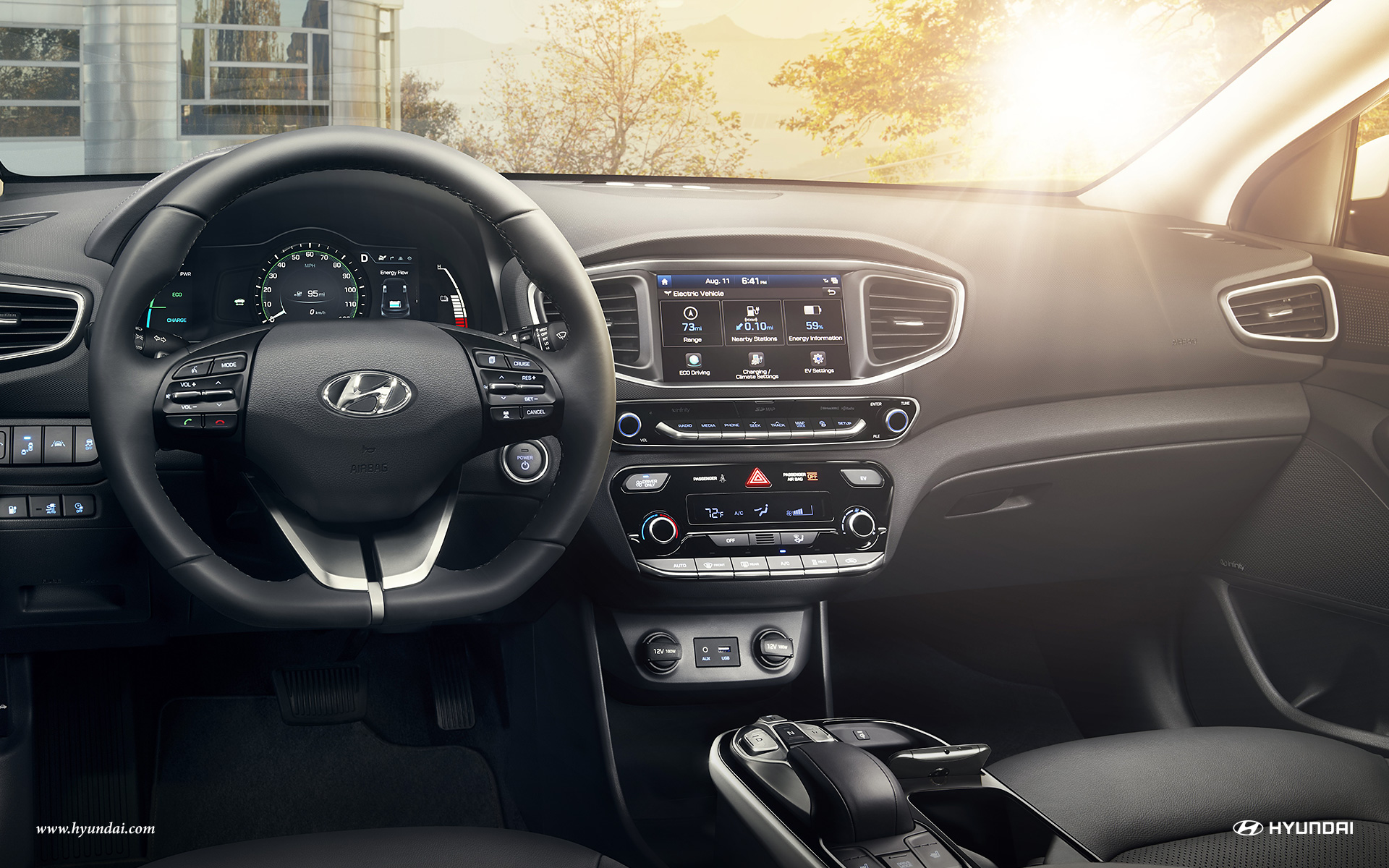 The Ioniq’s steering wheel is wrapped in smooth and sumptuous leather. The wheel’s front face has the controls for the radio, phone, and cruise control. Its back contains fine aluminum paddles that adjust the intensity of the regenerative braking.