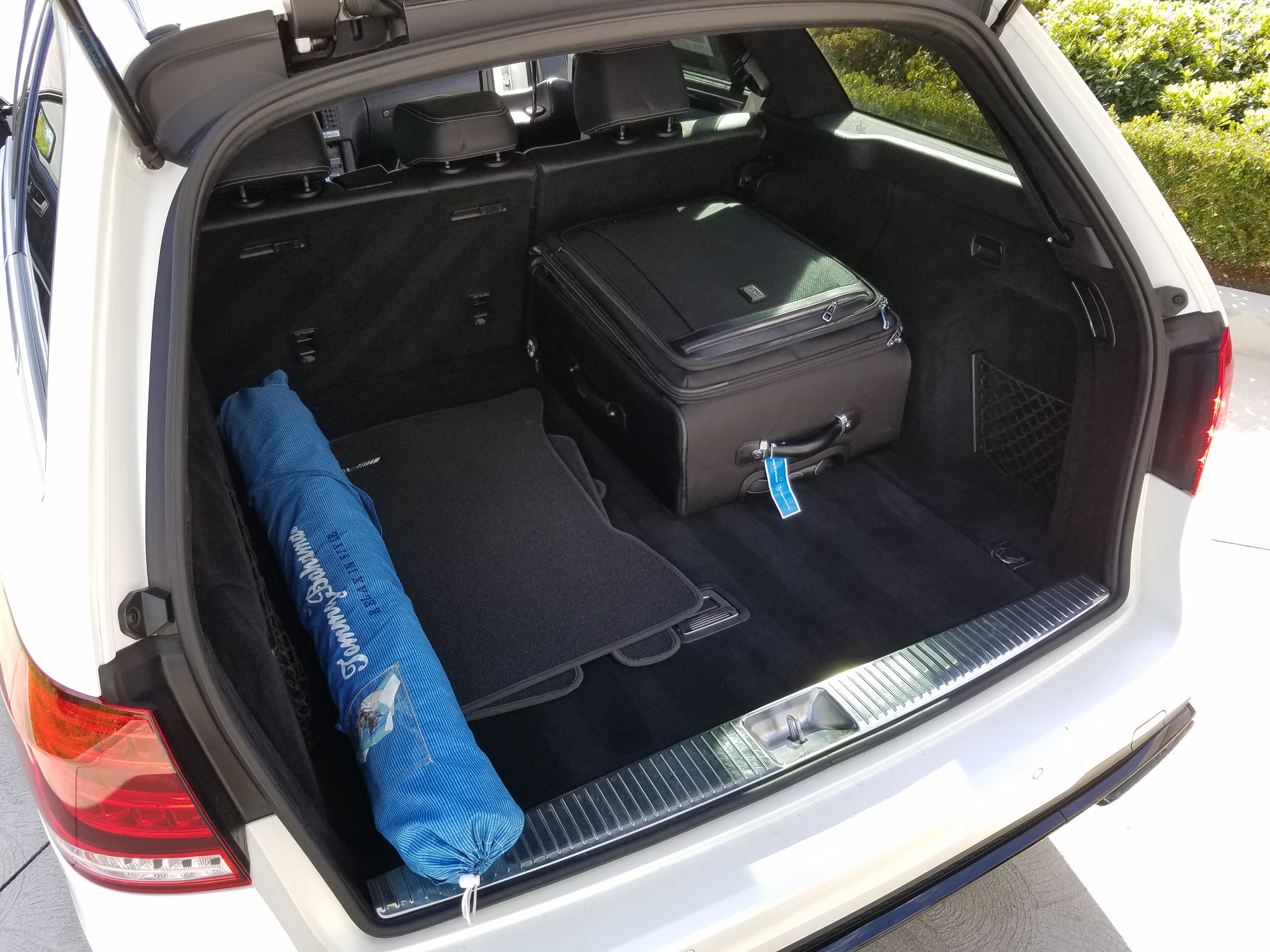 The E63 wagon’s trunk is the largest I’ve seen in any vehicle behind the rear seats. While just an inch or two too shallow to swallow our immense beach umbrella fore-to-aft, the behemoth Tommy Bahama fits side-to-side. My benchmark 25” Travelpro suitcase slides deep into the trunk, and I find ample room between it and the tailgate. Four of these 25” bags would fit easy-breezy with space left over for a carry-on or two.