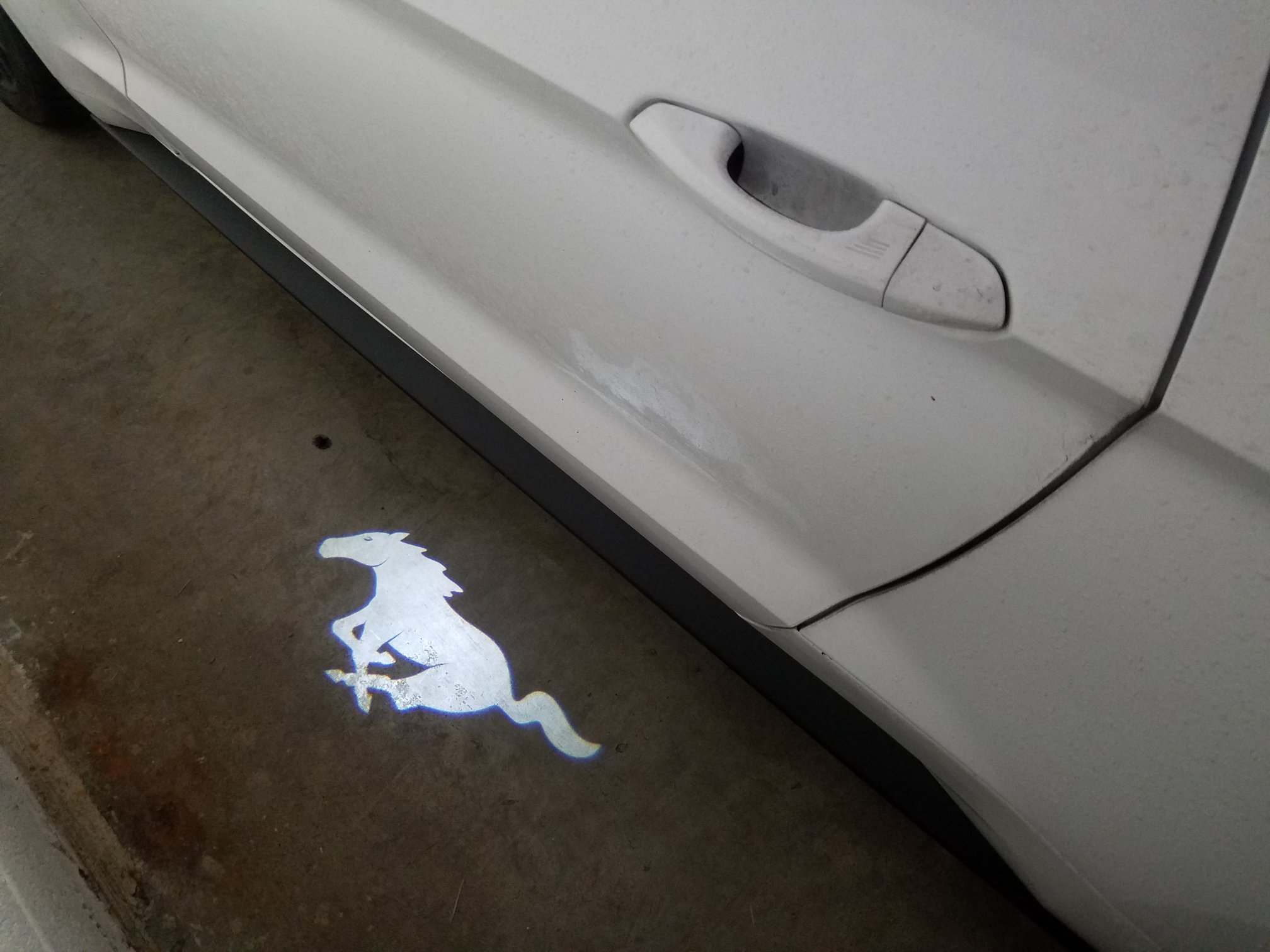 I get home in time to take my daughter and wife out for dinner. In the dim light of our garage, my daughter is captivated by the galloping-pony puddle light that the Mustang projects onto the ground. I find the light show to be both incredibly corny and incredibly cool. (A Chevy Bowtie would not be nearly as evocative or fun.)