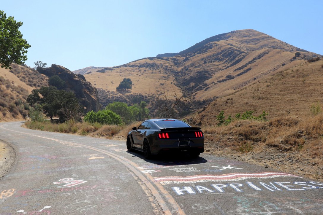 The GT350 does zing through its 16.0-gallon fuel tank. We make an unplanned detour to the nearest gas station and arrive with the needle on empty. (Fuel economy over the mountain was ~9 MPG.) The side trip turns out to be a blessing because Del Puerto Canyon Road is better paved than San Antonio Valley Road, and we finally get a taste of the GT350 in its element.