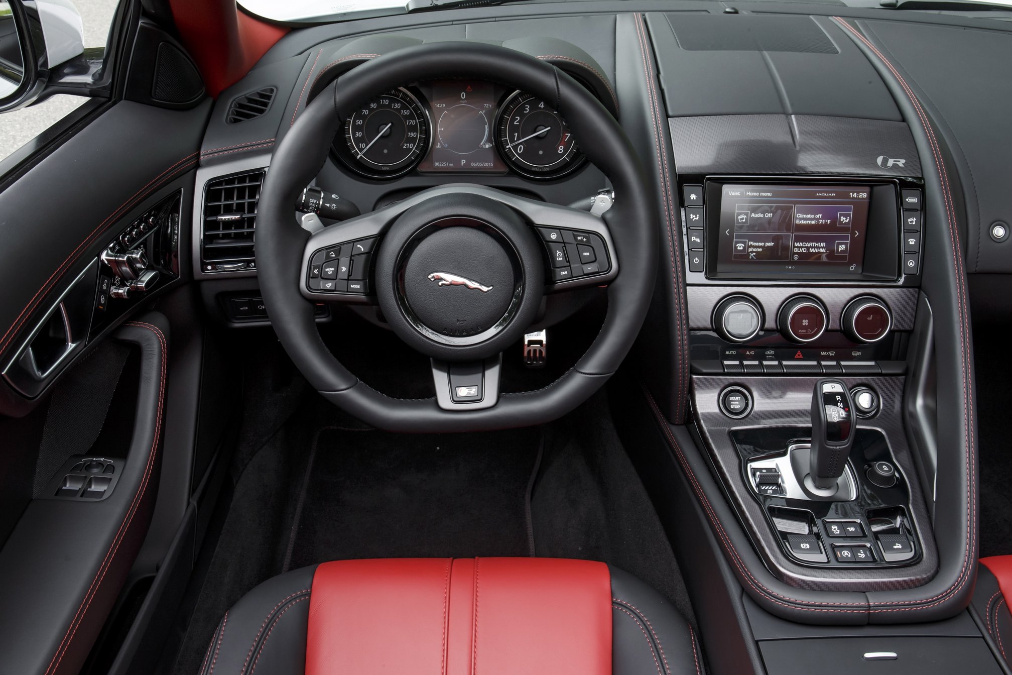 My chaperone toggles the drive mode into the checkered-flag mode for the final straightaways of the test route. I peg the throttle in second gear, feel the F-Type surge forward, and then feel the car reduce power as the engine blasts into its otherwise potent mid-range. Who stole my power? I don’t see the traction control light blinking. (Plus, the car is AWD!) I try a run at the horizon for the second time and cleanly pull to redline. Now the F-Type R feels light and ready to rocket!