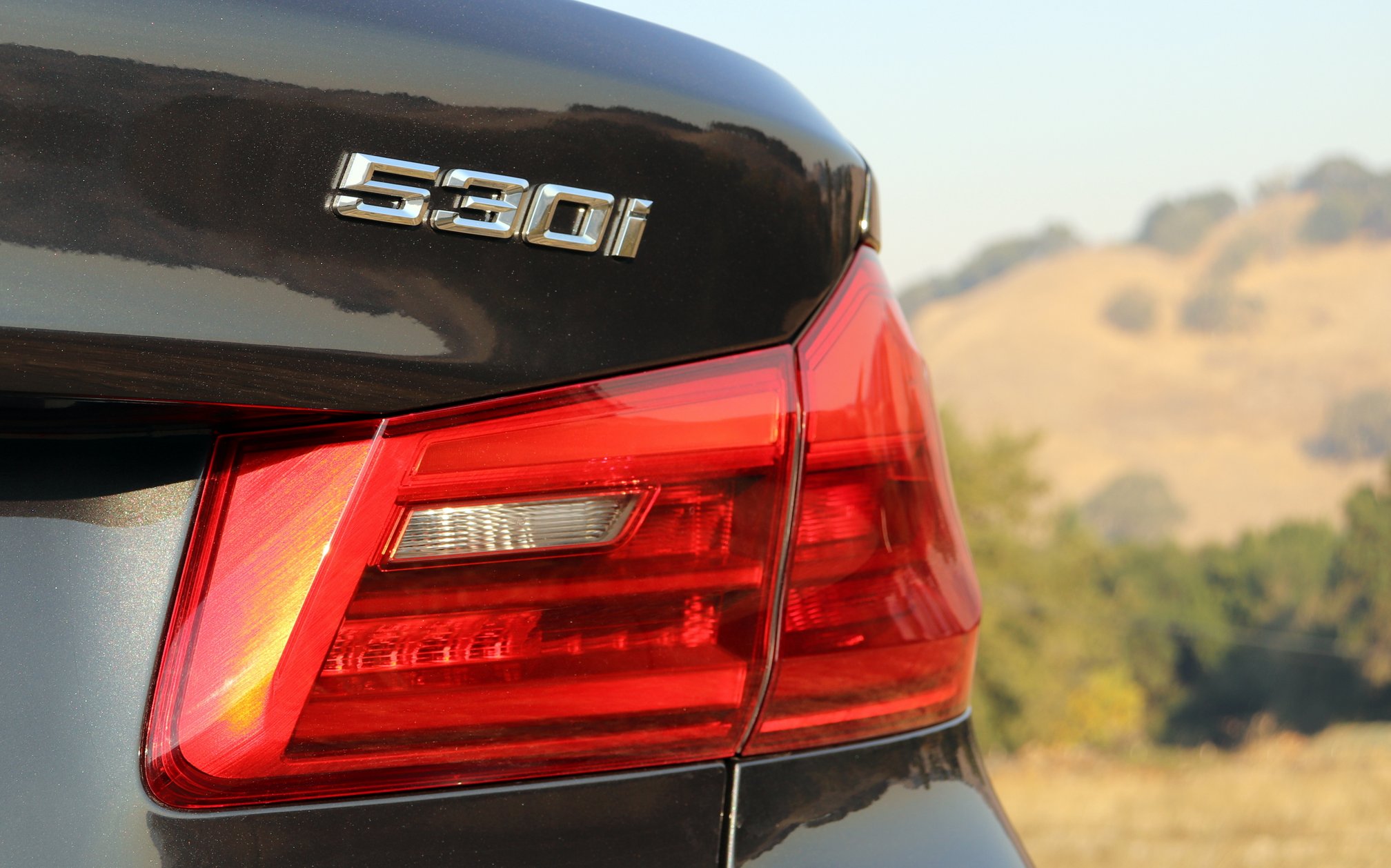 Firm and fadeless brakes bring me to a halt in the heart of hilly ranch country. I turn off the engine and shoot exterior photography of the 530i. What a bland car! The 530i’s long hood lacks any character lines and ultimately droops down towards the bumper. Large unsightly fender gaps frame the 18″ wheels and tires (245/45 Hankook Ventus S1 noble2 all-season run-flats). Tacked behind the front wheels are air vents that look like hockey-stick blades. They are a feeble attempt to spice up a Breyers vanilla design.