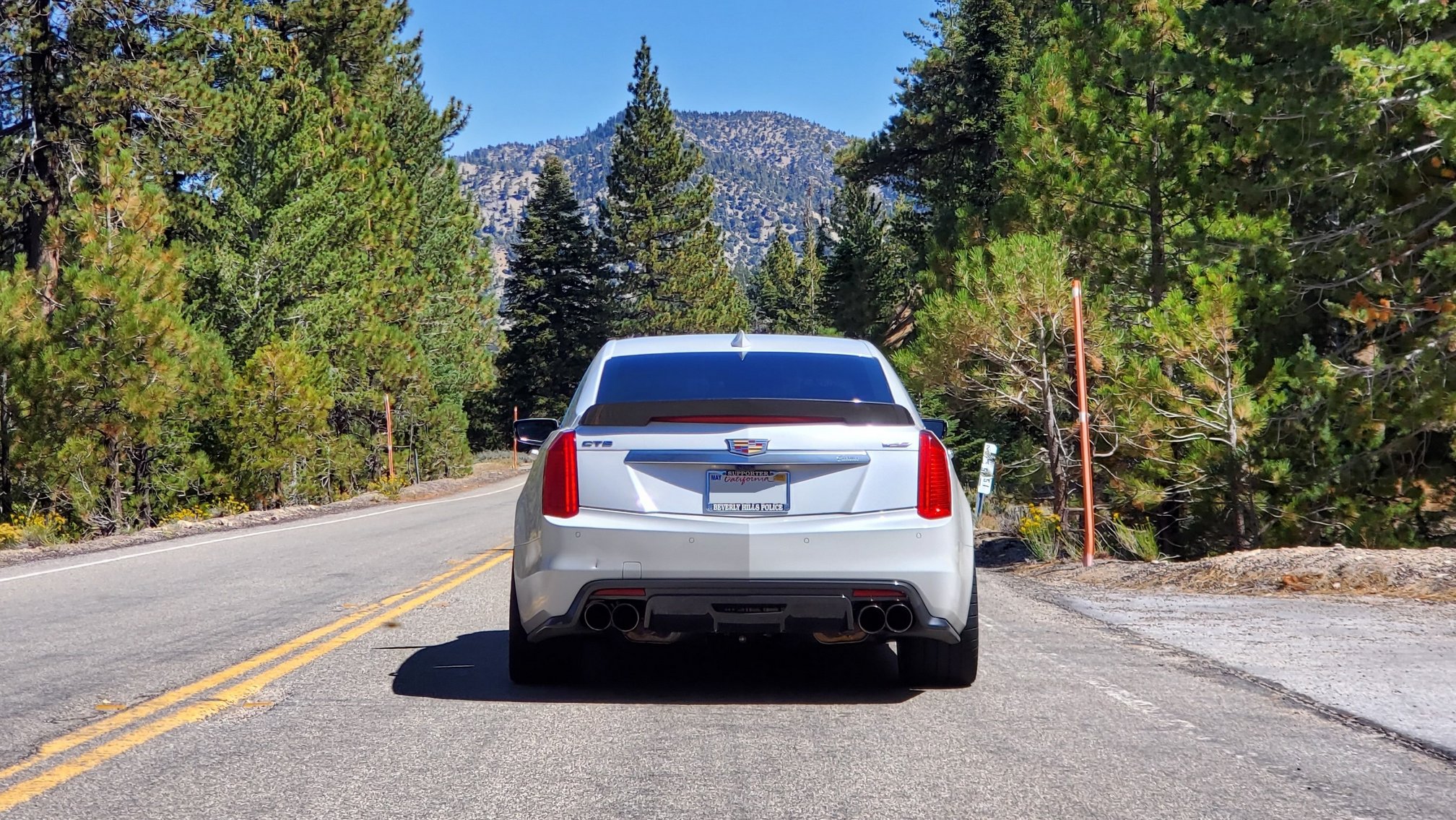 After 95 mountain miles (at 7 mpg), the fuel tank is empty. I stop in Wrightwood to refuel. A man in a Toyota 4Runner compliments the CTS-V. Giddy gas station attendants ask me to send it 0-60 mph in front of the station? Ha! No. I’d like to keep my license.