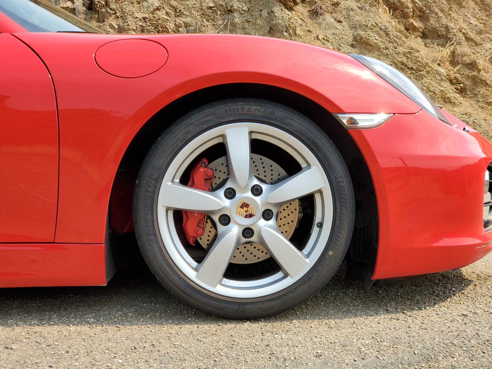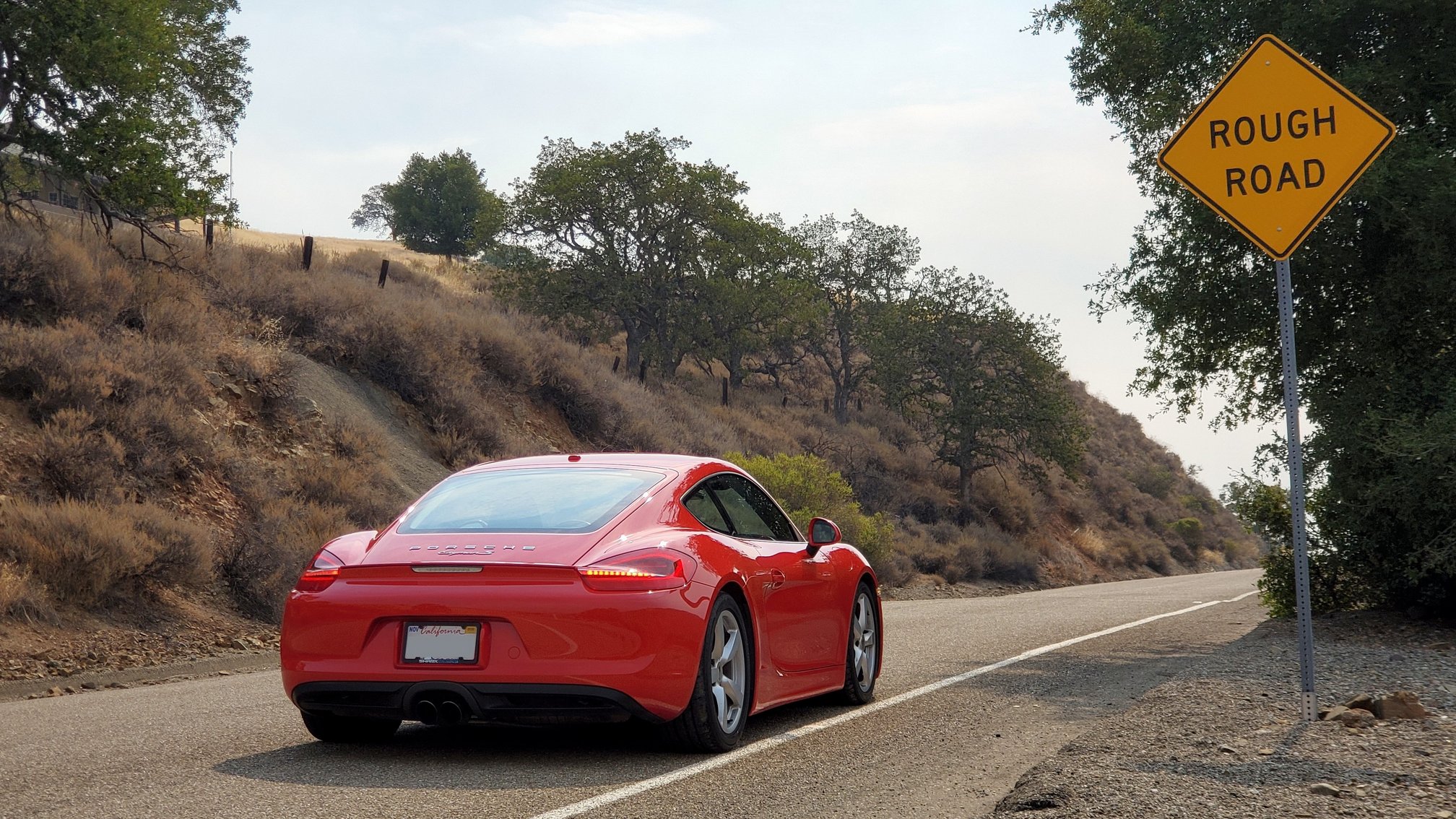 I chase an odd road fellow, a right-hand-drive Jeep Wrangler, into suburban San Jose. The Wrangler was breaking a sweat on Quimby Road’s tight turns, but it would never wince at the challenge I’m now facing, a gas station driveway ramp. As a Porsche sports suspension driver must do, I eye the ramp with suspicion, hold my breath, and then approach at a sharp angle… I’ve cleared! Dear everyone, buy a Cayman with a different suspension for daily duty.