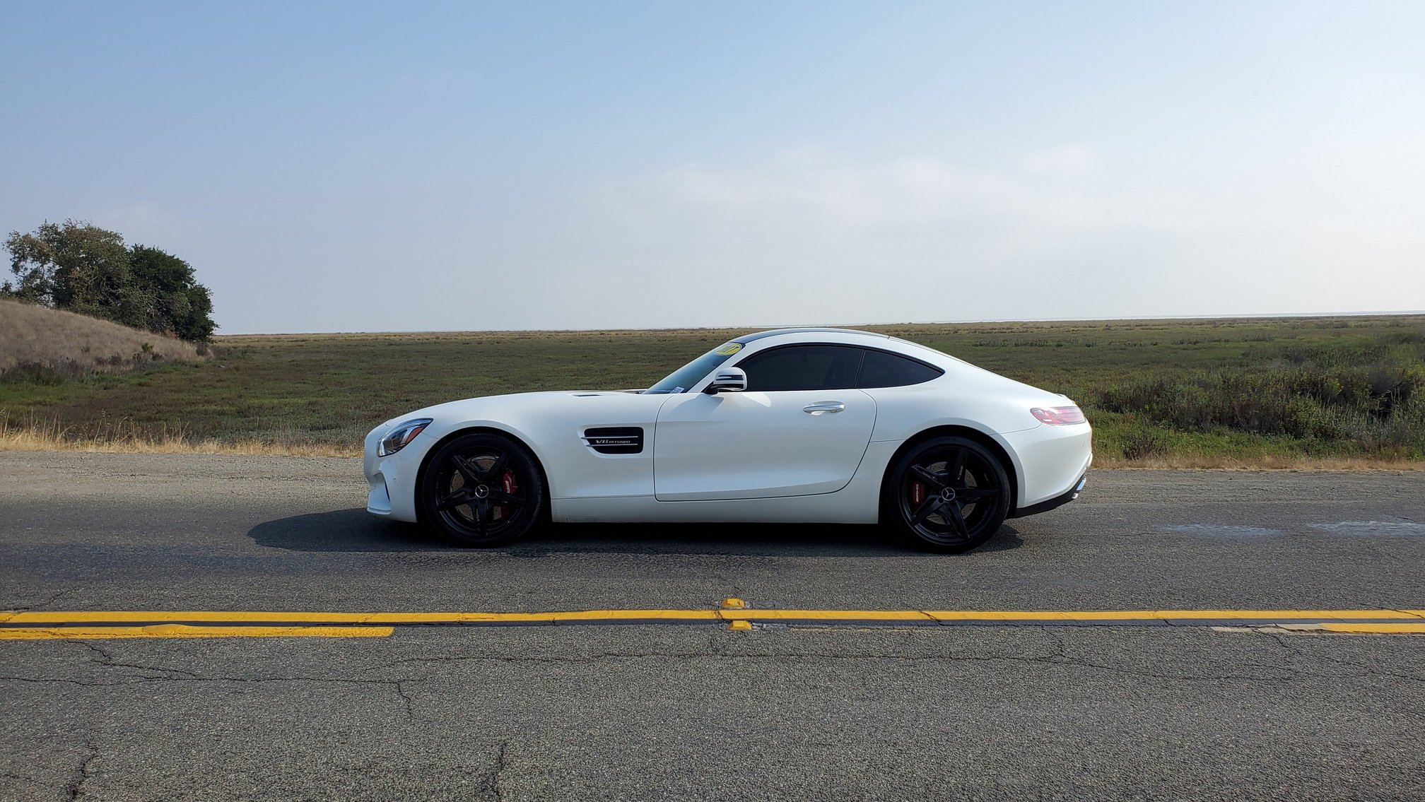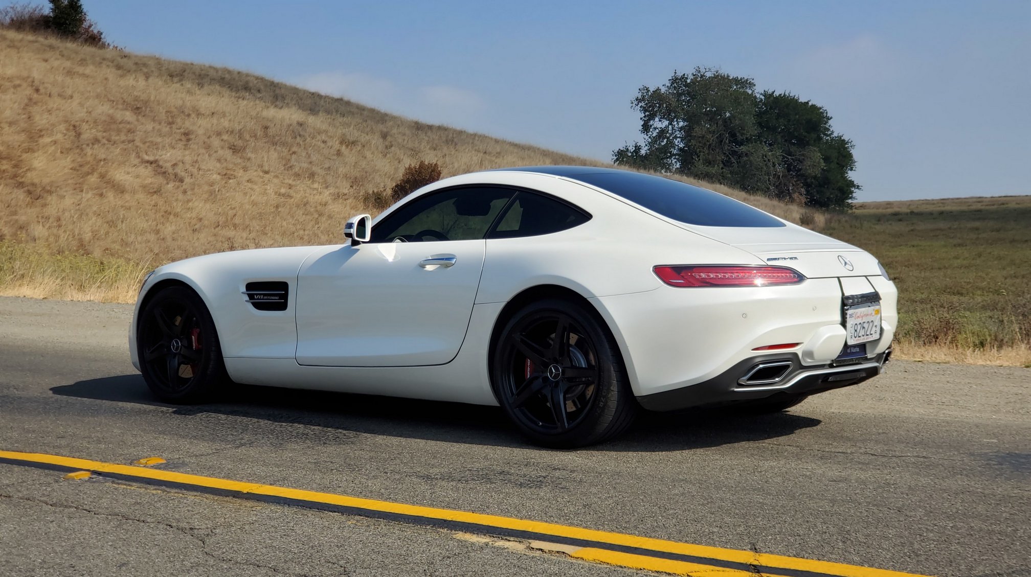 From the curb, I don’t see any visual clues that this white GT is a base model rather than a mid-range S. The only sure way I know to differentiate the two is to peek at the tramp-stamp badge on the big girl’s butt. But that won’t work today because some image-conscious individual—who didn’t want to let the world know he “cheaped out” on a base AMG GT—has removed the GT tattoo from the car’s curvaceous derriere.