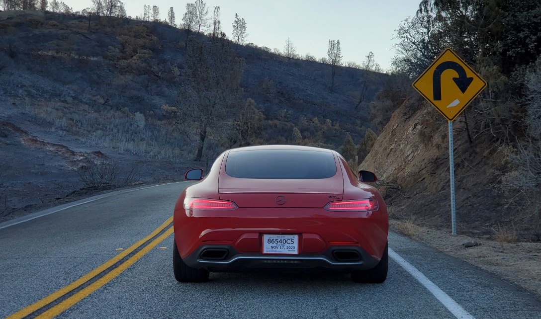 Gloaming. The night’s inky sky starts to wash clear as I summit Hayward’s Pass and Livermore Valley spreads before me. I’ve entered the hour of silhouettes. The gradually lightening sky gives contrast to the world around me. The receding hills draw gentle curves in front of the building indigo. Human-scale is given to the Rorschach landscape by an oak’s bushy blot and a barn’s sharp edges. In the foreground? The dark shape of the AMG GT S’s long nose is capped by the blur of speeding pavement under the headlights’ flood.