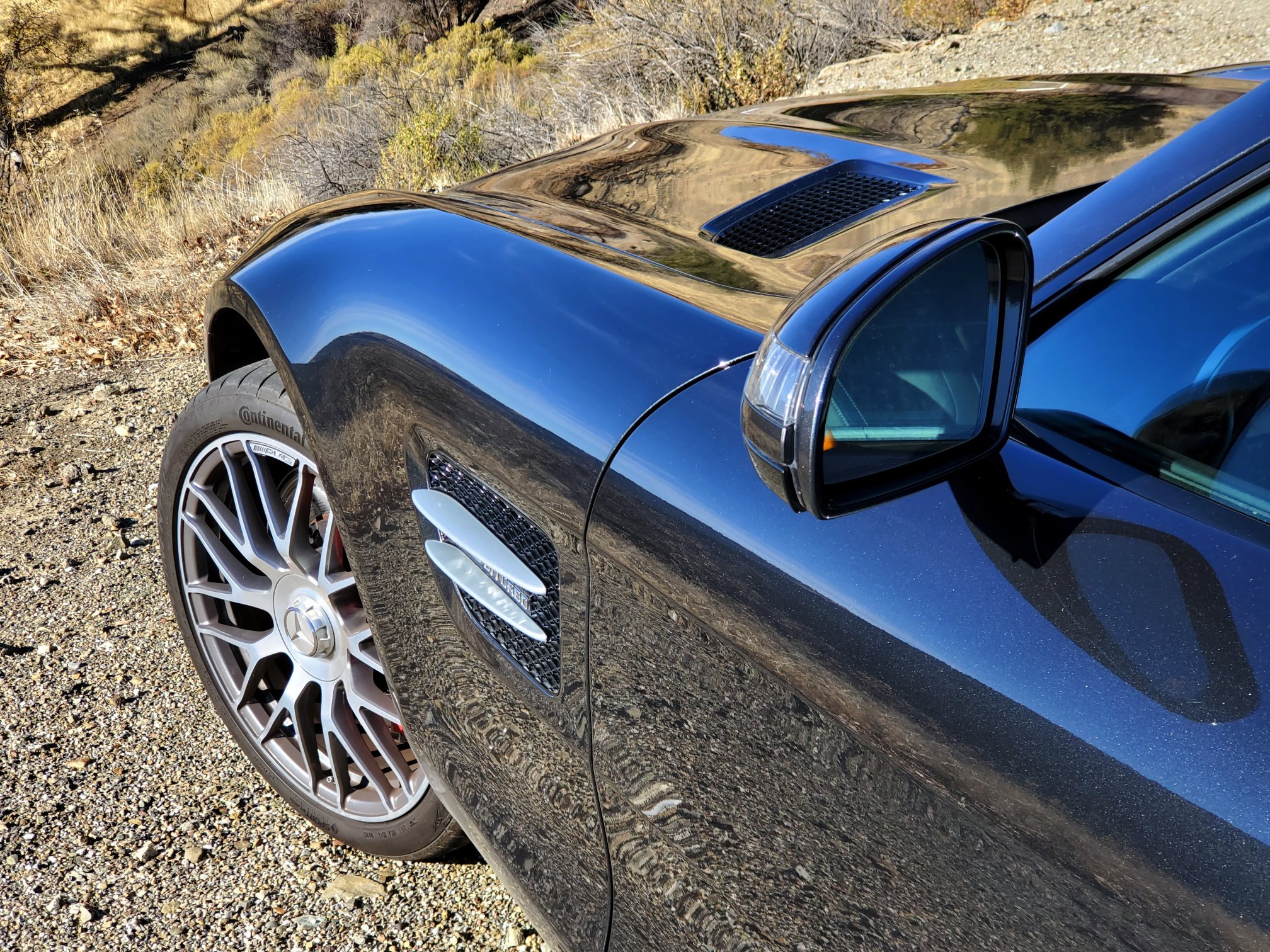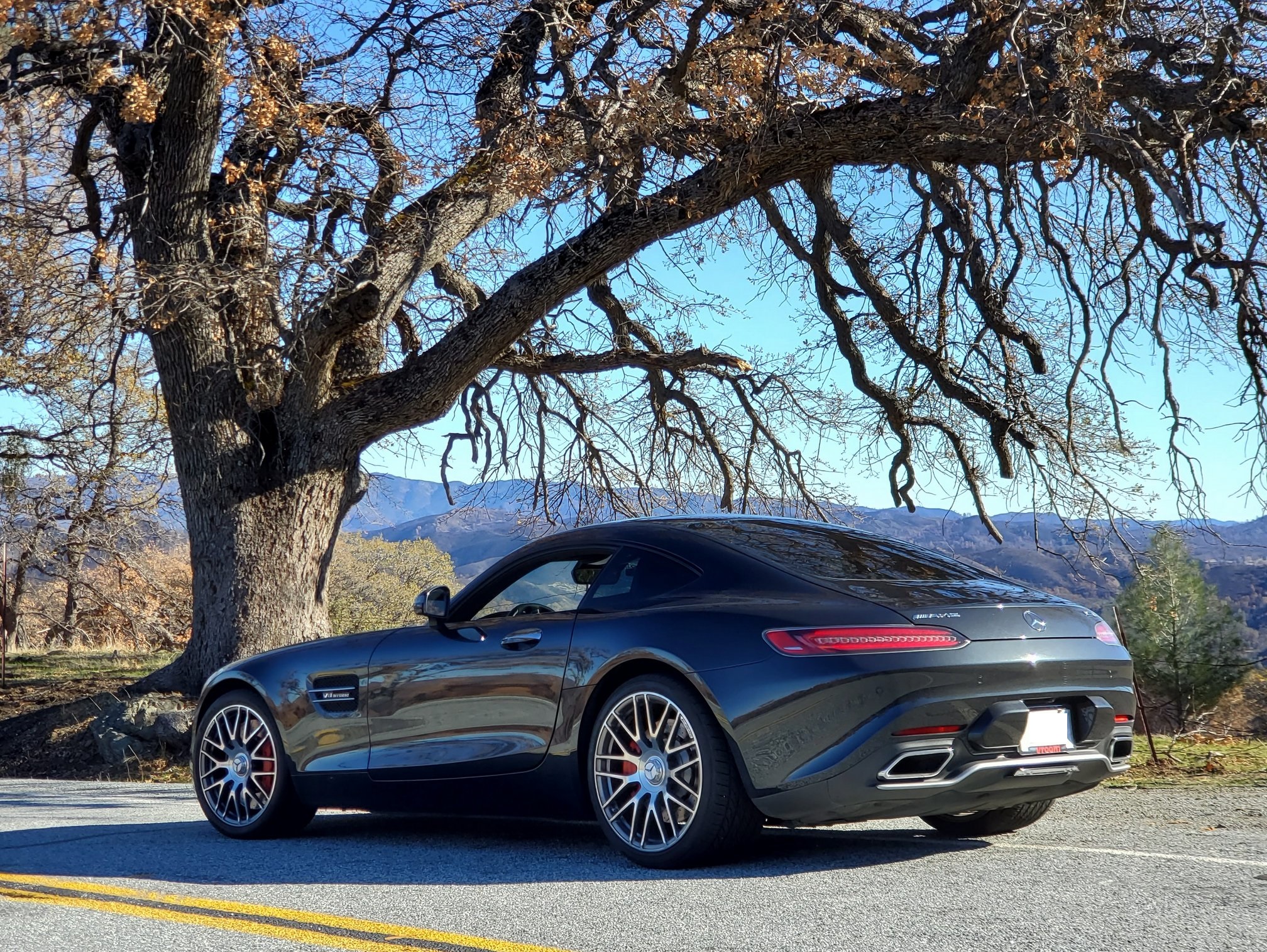 I only stop for photography and biology. On both accounts, I’m delighted to see my favorite oak alive and well after the region’s recent fires. Its grand trunk and gnarled branches give time to the backcountry scenery. I can imagine cowboys resting under this tree, their horses tethered to its trunk. I idle my steed under the same canopy, snap photos and munch on lunch. The AMG’s stump-pulling 479 lb-ft of torque says it is a draft horse, but its sleek lines and fiery temperament say it is a thoroughbred.