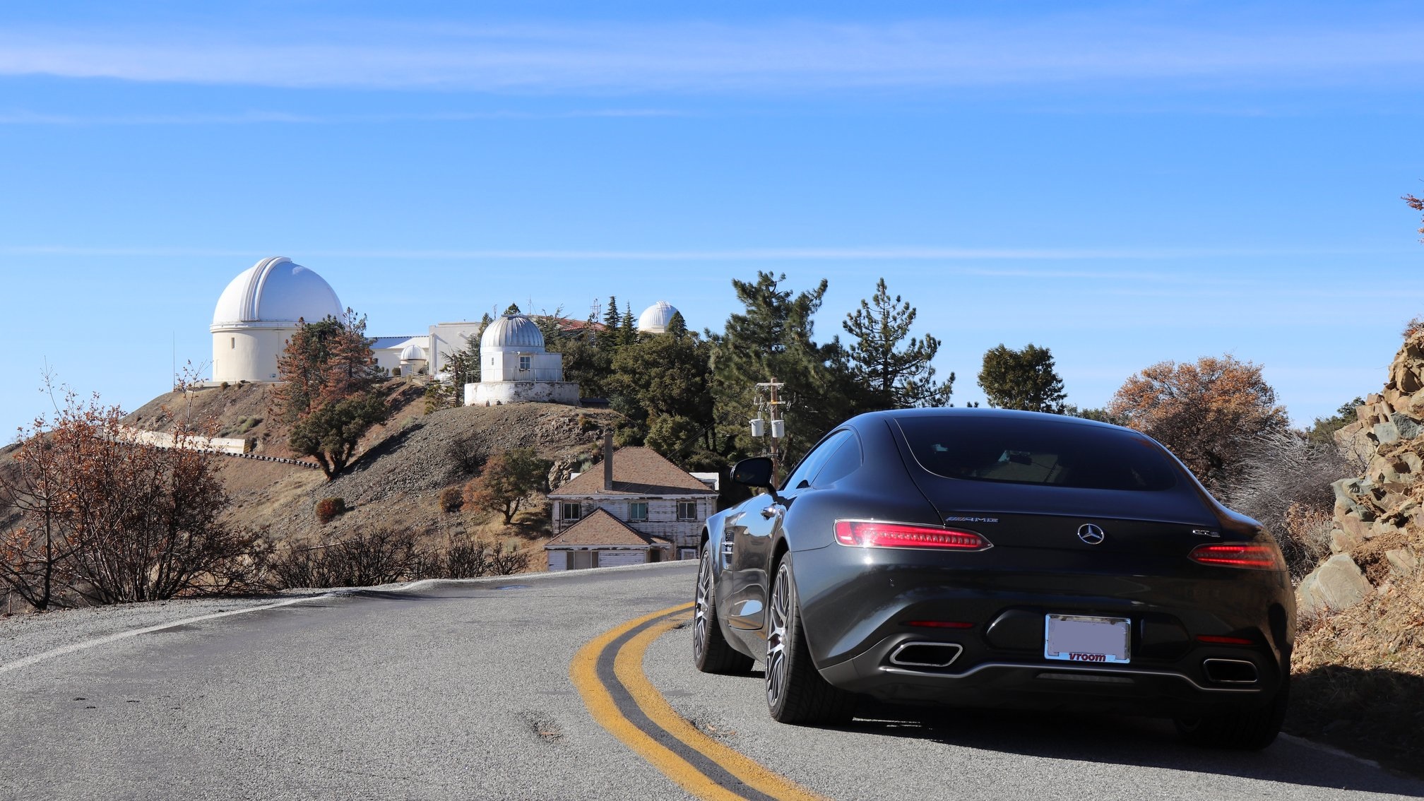 Rested and refueled, I make the final rush to Mt Hamilton’s summit. The stacked hairpins allow me to play with the stability control settings. In the full-on position, the ESP shuts down shenanigans before they even start; I don’t use this mode at all on my backroad blitz. Sport ESP lets me drive right up to the limits, but not an inch beyond. When I want more rein—and the opportunity to paint the pavement after the apex—my only option is to switch ESP off. (I’d love to have the rotary dial from the AMG GT R that lets you draw back the traction control bit by bit.)