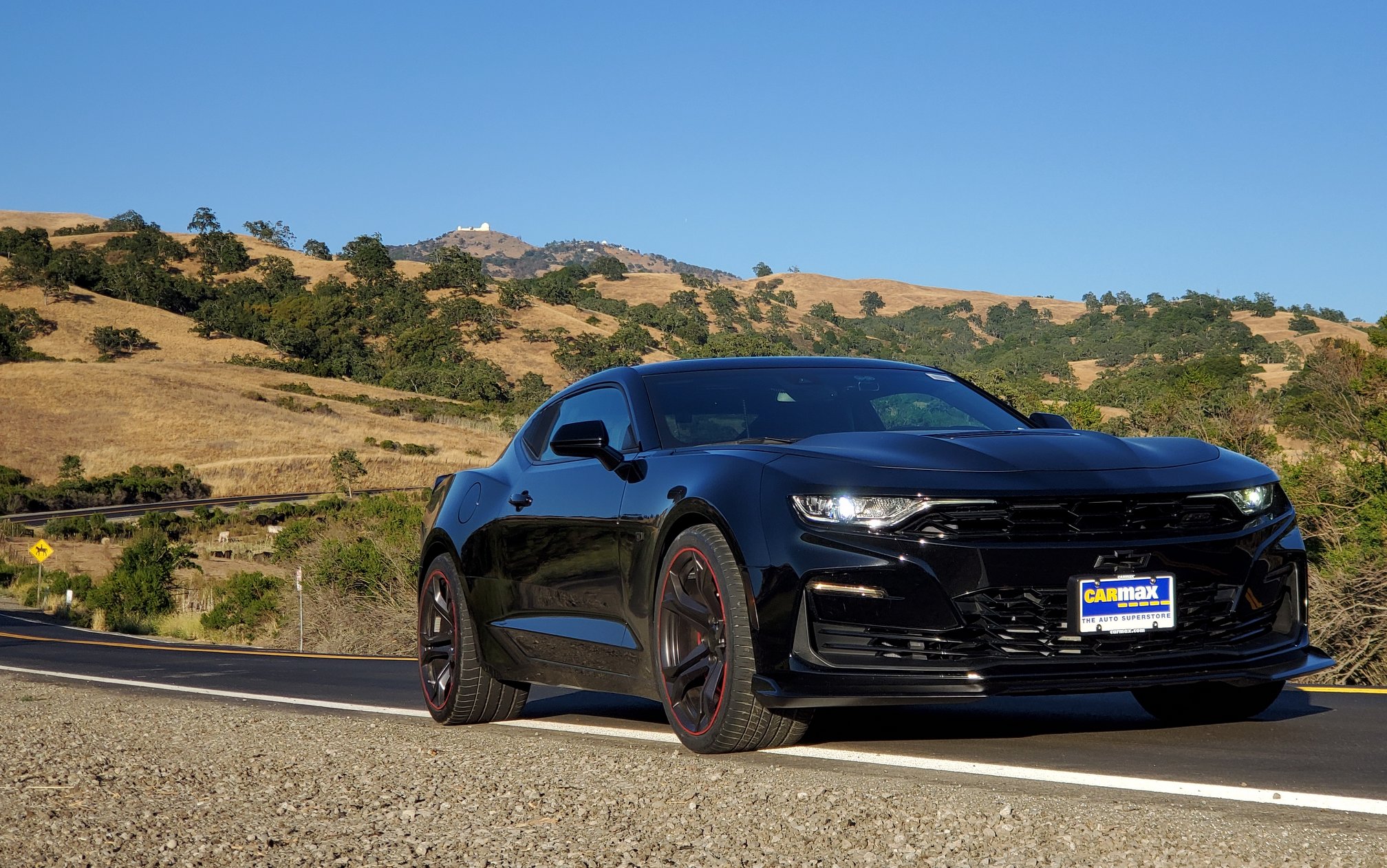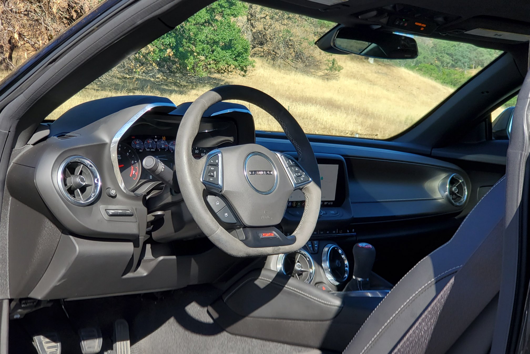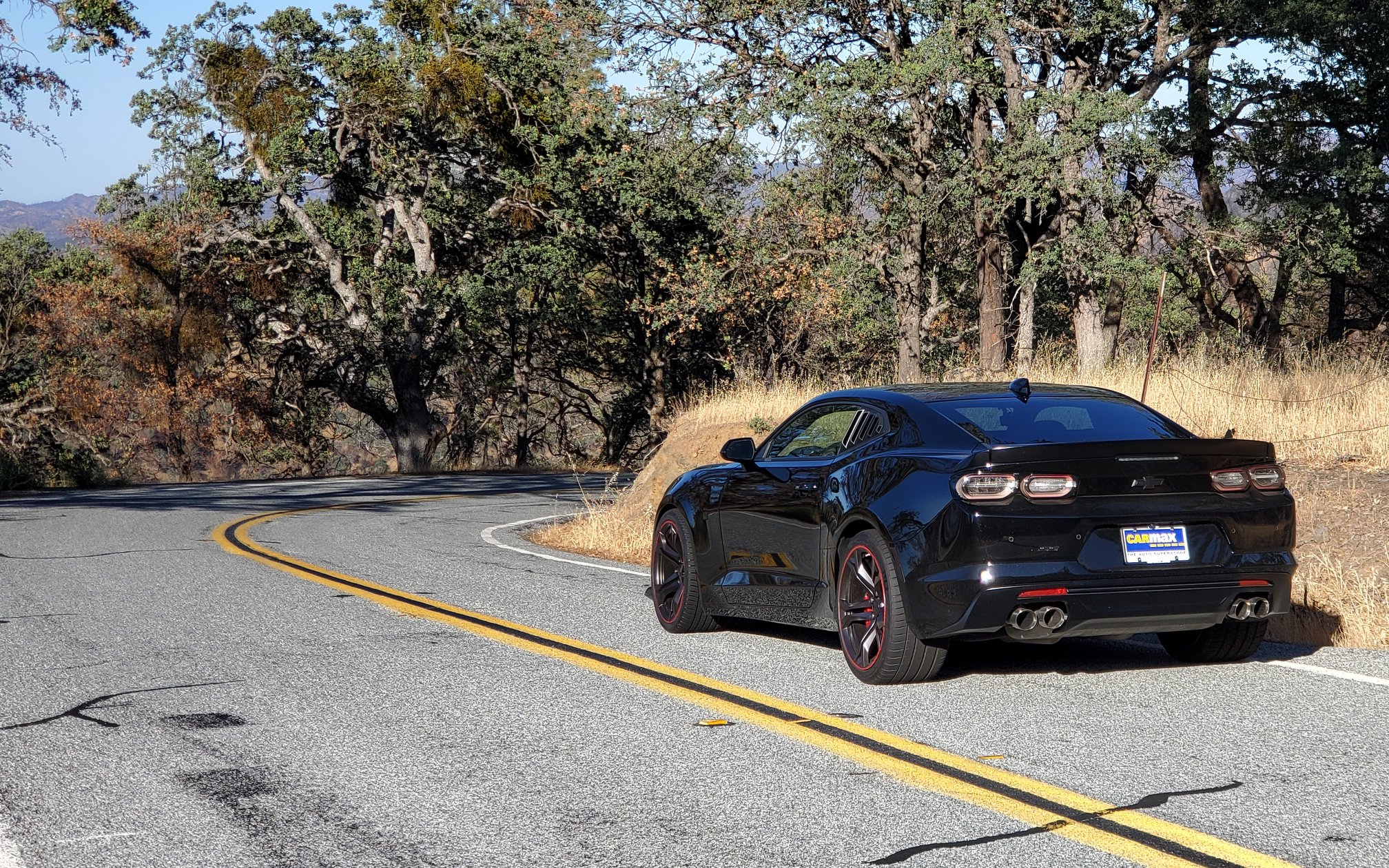 Up and down the grade I go. Golden sunlight floods under the oak trees’ gnarled branches and backlights the blond grasses. I’m having a fantastic evening, yet I feel guilty about destroying the twilight’s peaceful silence with the V8’s brassy bellow and pyrotechnic pops. (The only kindness the Camaro SS extends to nature is in scaring wildlife off the road before it comes roaring around the corner.) Maybe on a race track, I could enjoy the SS’s downshift woof and rising staccato howl with a clear conscience.