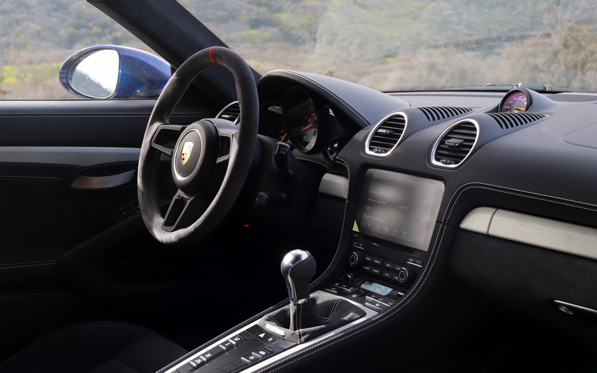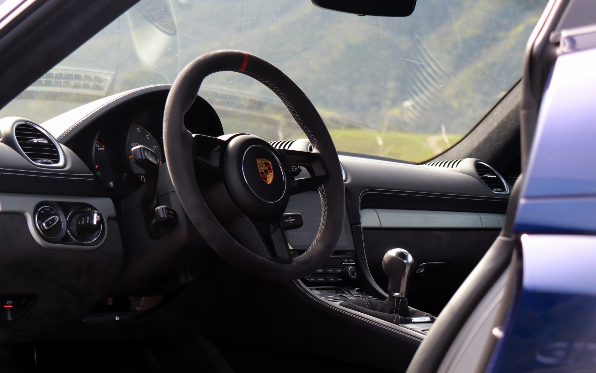 The GT4’s steering wheel is thin-rimmed and Alcantara-trimmed. I admire its focused design: it’s a simple hoop and button-free. This is a car for driving, not satellite-radio channel surfing!