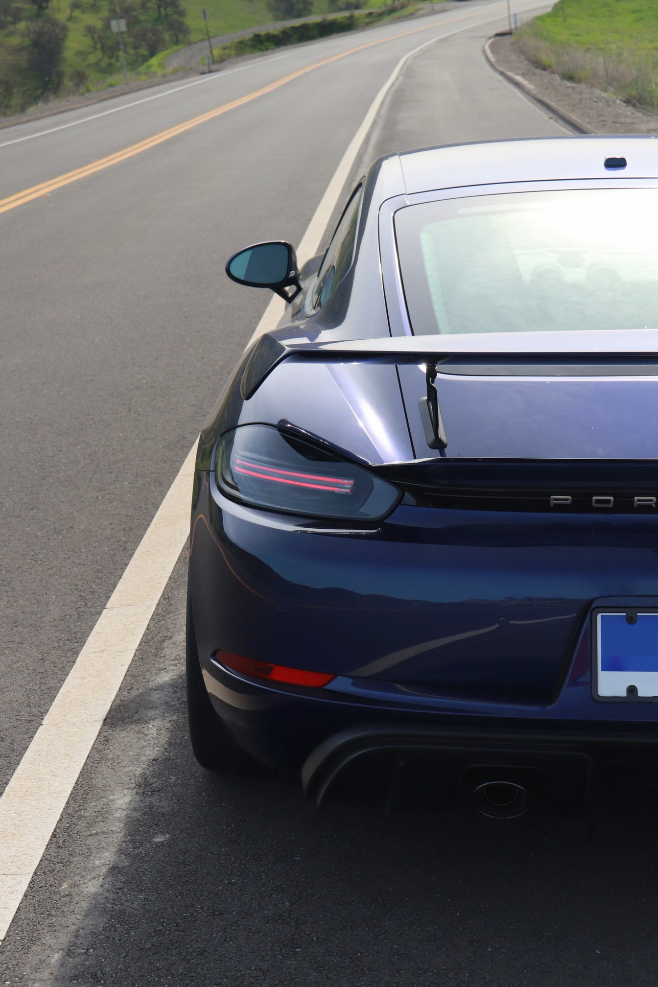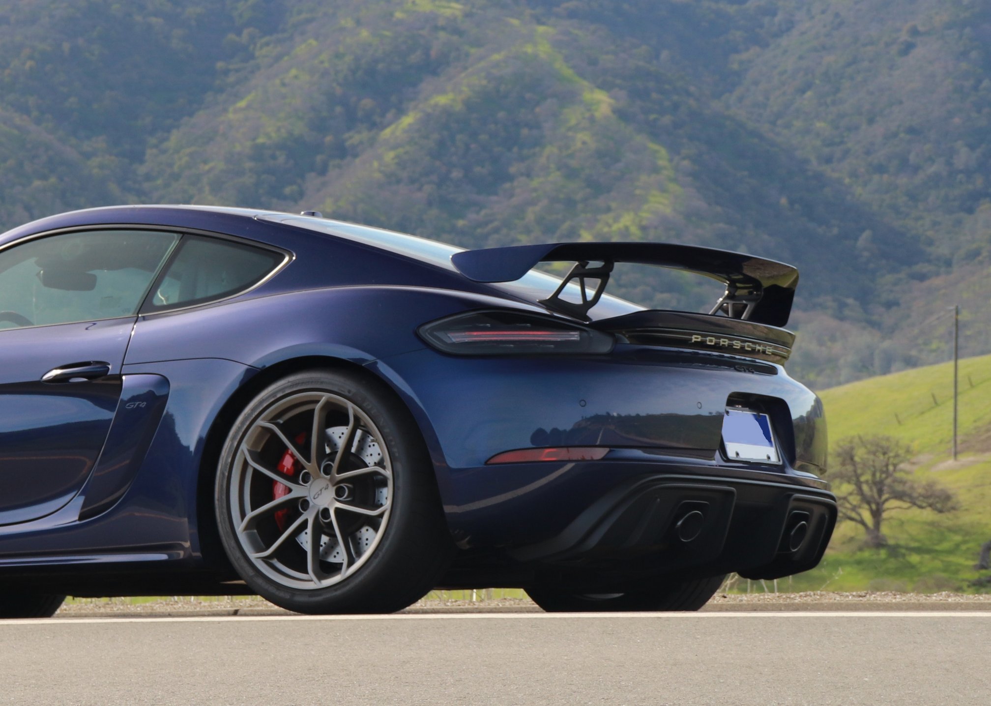 The 718 Cayman GT4 is hidden in a packed parking lot. With its tall GT wing protruding from its back, it seems like a shark among minnows. A quick look around the GT4 suggests it’s gone hunting before; the whole body is wrapped in paint protection film, and its tires show evidence of intense heat and wear.