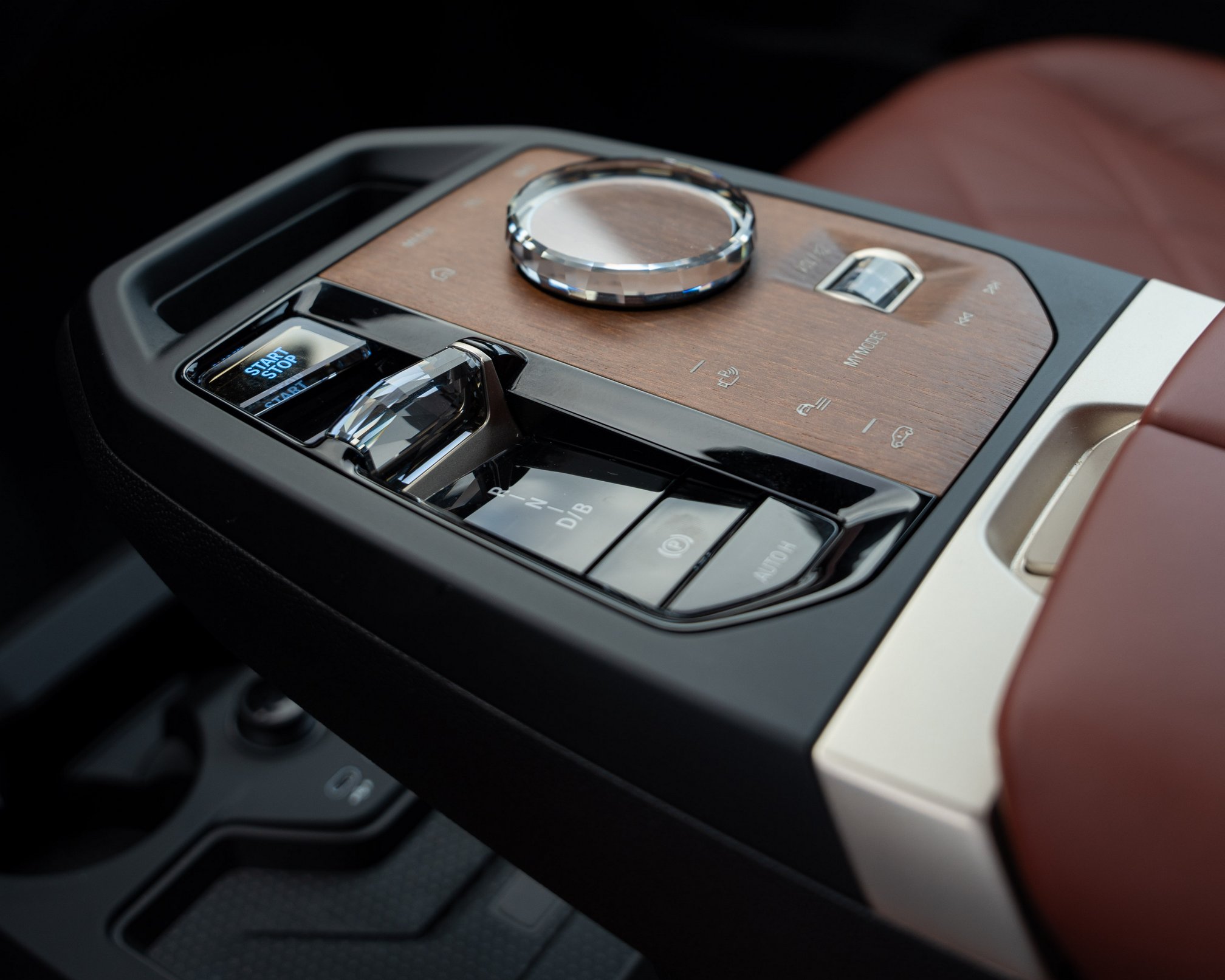 It takes a moment for me to settle into the iX M60. I’m surprised to find the seat controls on the door—this is where Mercedes traditionally puts them, not BMW. The new placement may be because the sliders are now made of ogle-worthy gold-tinted glass. I admire them as I move the seat into position. Gold glass is also used for the gear selector, iDrive controller, start button, and volume dial.
