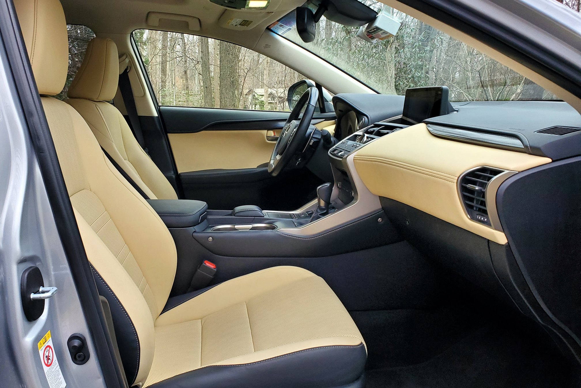 The steering wheel is familiar from the IS 350, but the dashboard is different. A floating infotainment screen tops a stack of physical HVAC and radio controls. Lexus’s antiquated haptic-feedback trackpad sits alongside the shifter. While the infotainment technology is outdated (the NX was redesigned for the 2022 model year), the angular dash remains attractive, and the upholstery is high quality. My eyes and hands agree that this is a luxury interior.