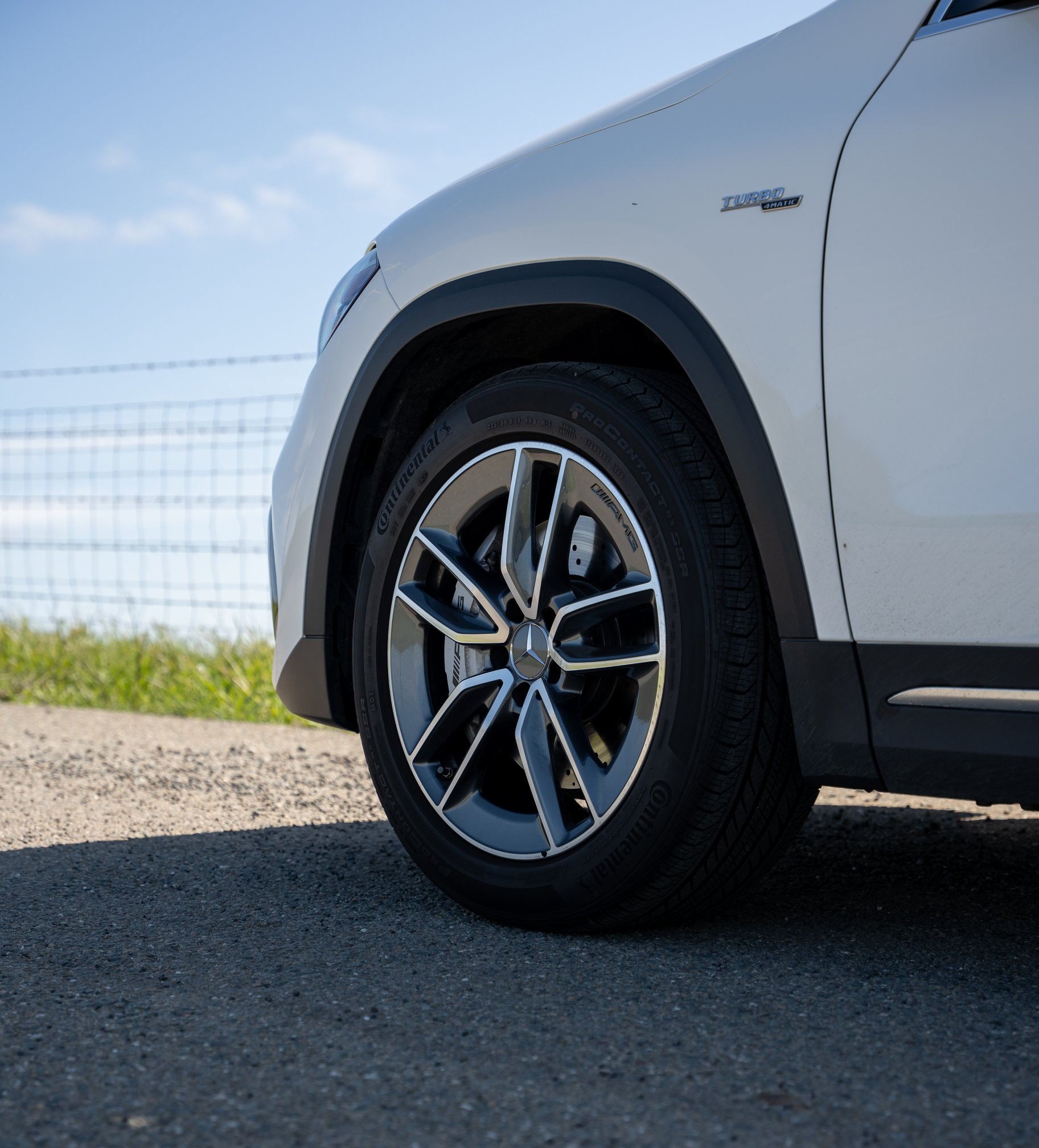 It’s a stellar performance that is matched by the alert front axle. There isn’t an iota of play in the steering, and the GLA 35 follows my inputs precisely and immediately. The 235/50 R19 Continental ProContact GX SSR front tires seem to have an inexhaustible grasp on the pavement—really, they just have more grip than I have guts—and the rear tires follow faithfully. Yes, here is an SUV that moves like a performance hatchback.