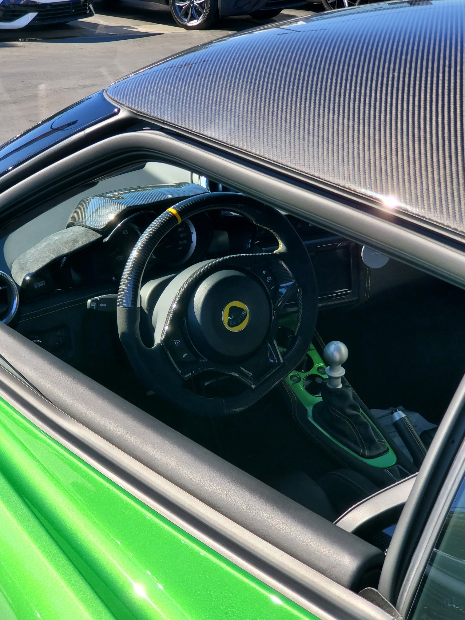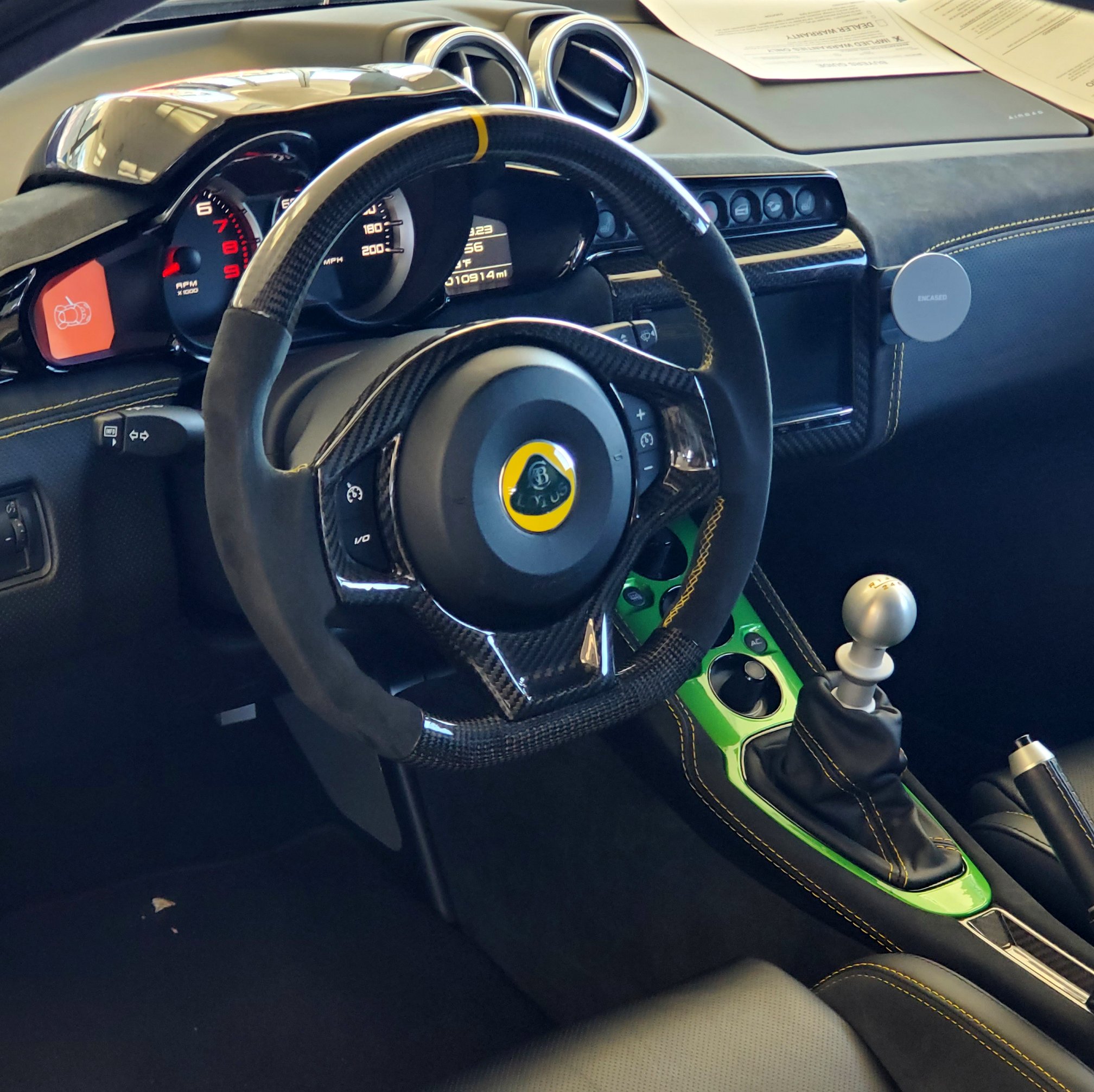 A salesman invites me to take the Evora GT’s driver’s seat. As I do, my attention is captured by the carbon fiber adornments on the steering wheel, gauge hood and seats. The bling continues with yellow-over-black upholstery stitching and a body-colored shifter surround. Someone hit the options list hard when they ordered this Evora GT!