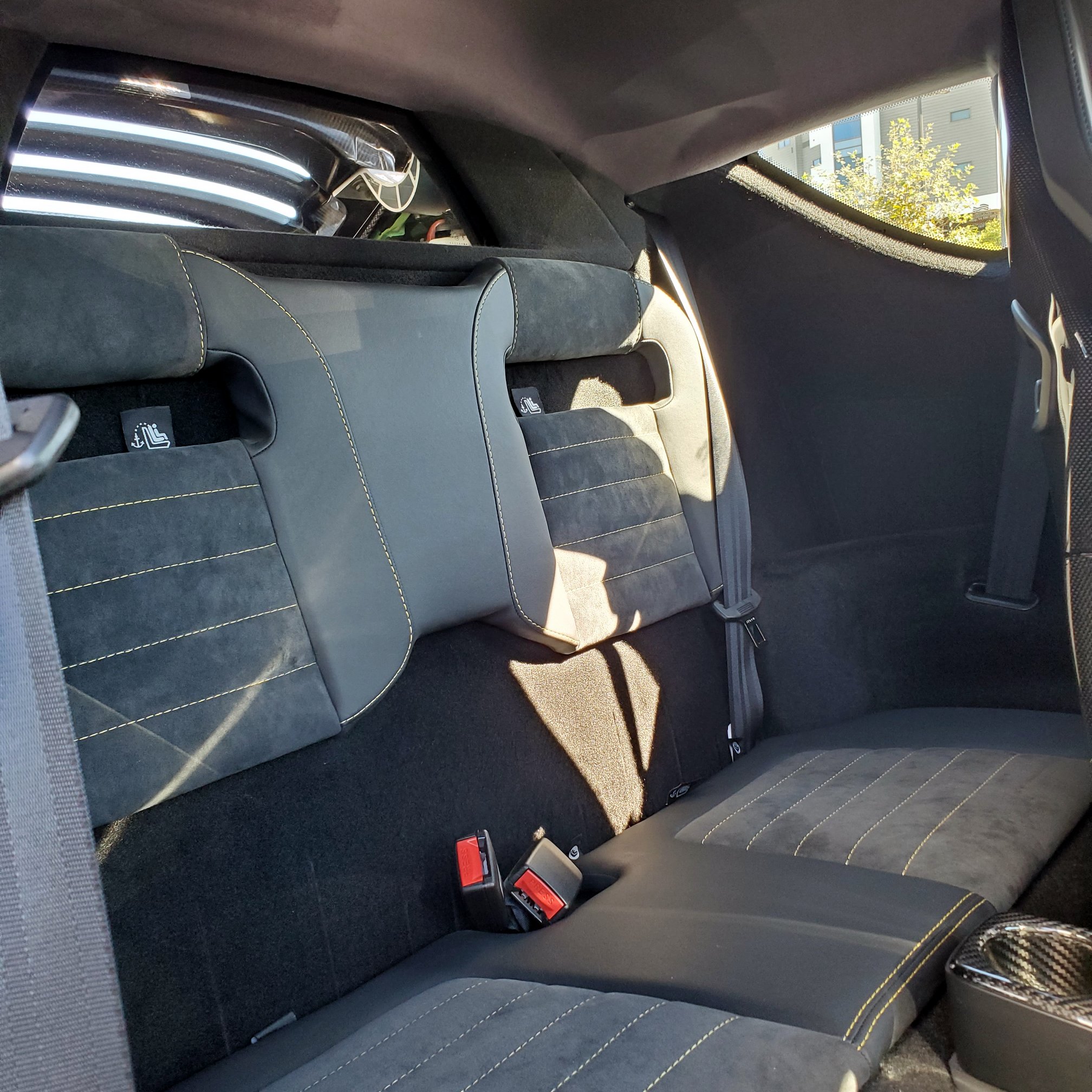 A peek over my right shoulder reminds me that this Evora GT is a 2+2; a pair of tiny rear seats with prominent LATCH-anchor labeling look back at me. (The Evora GT came as a 2+0, too.) I like taking my kids for drives, and it seems possible that slim-profile child seats could fit in the back. But it would be claustrophobic for my littles, and they might even have to sit crisscross applesauce if the adults up front were long-legged.