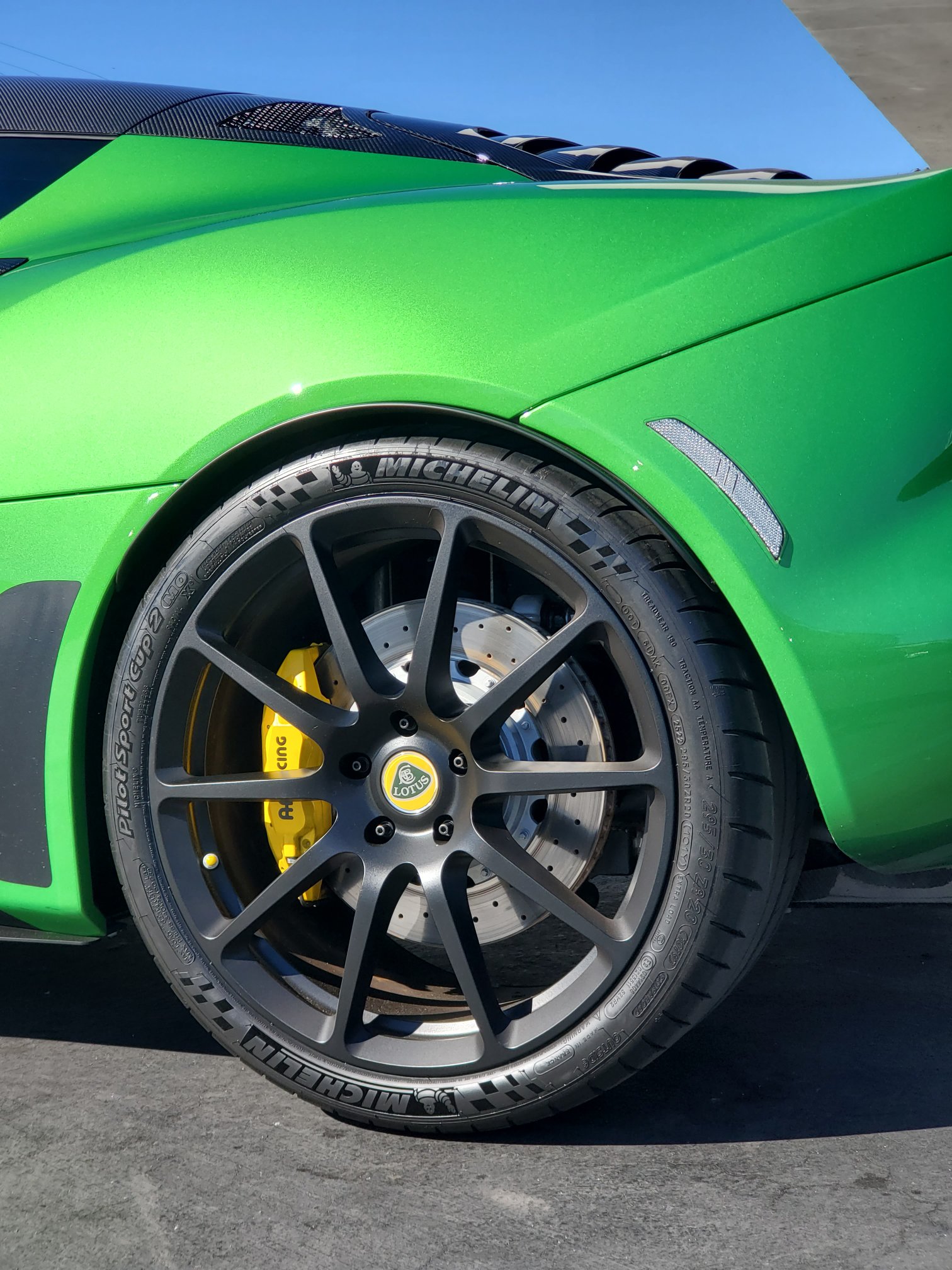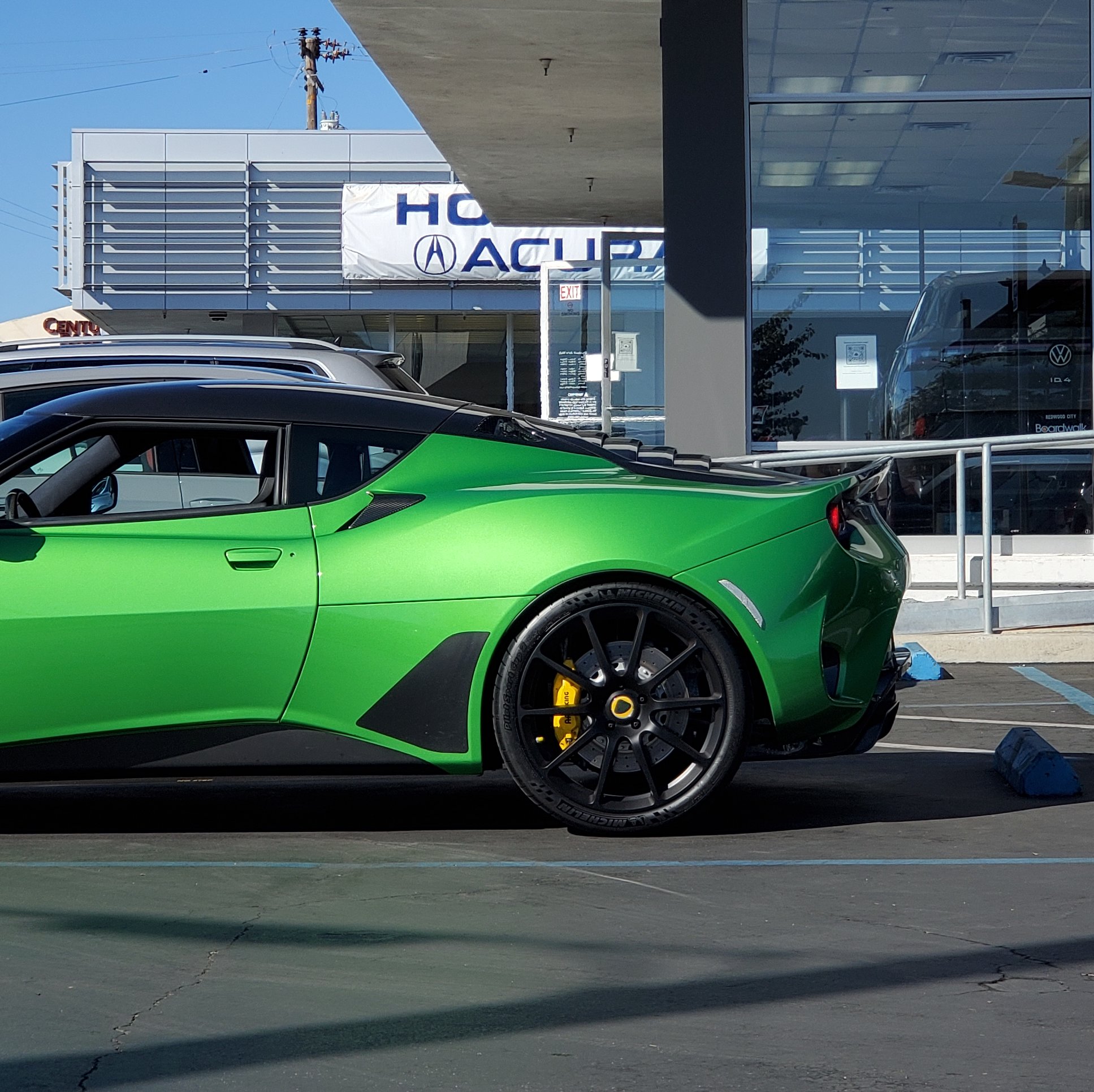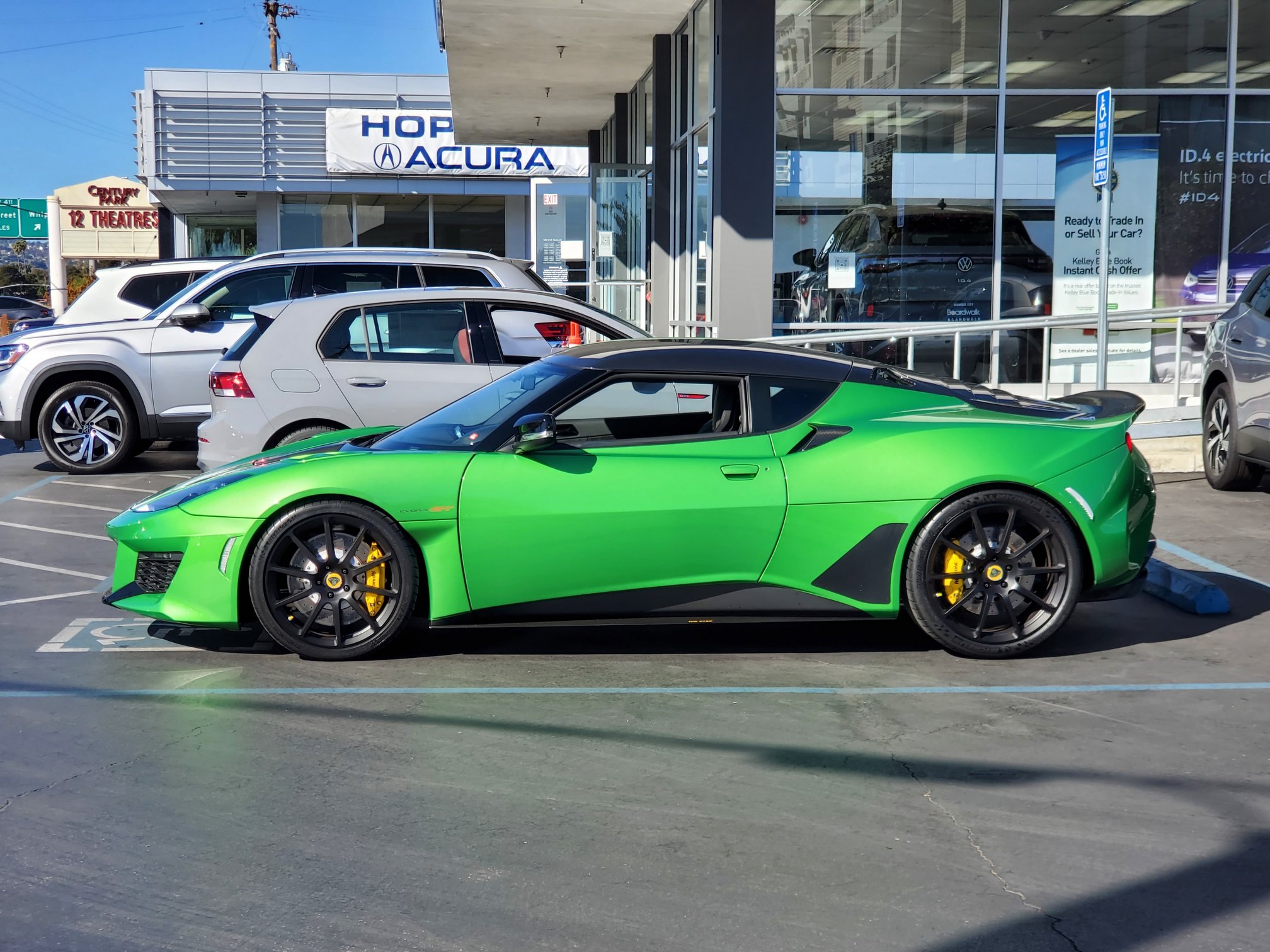 Gleaming like an emerald, the vivid green Evora GT backs out of the showroom and into the sharp morning sunshine. Its creased and sculpted lines are festooned with carbon-fiber scoops, gaping grills and vented panels. The Lotus looks angular, aggressive, and—in this bright color—made to snap necks at high speed. It’s over the top, and it works for me!