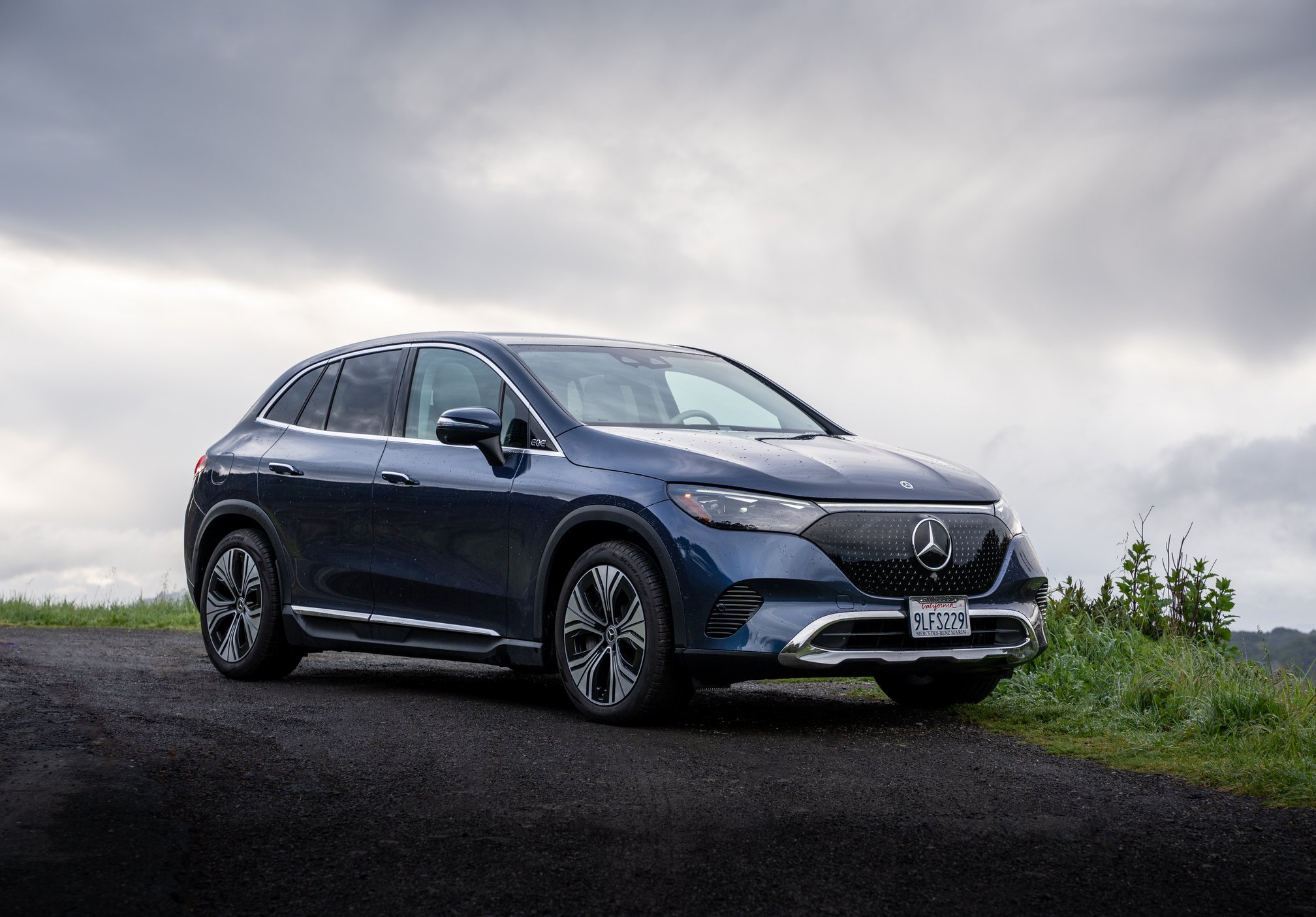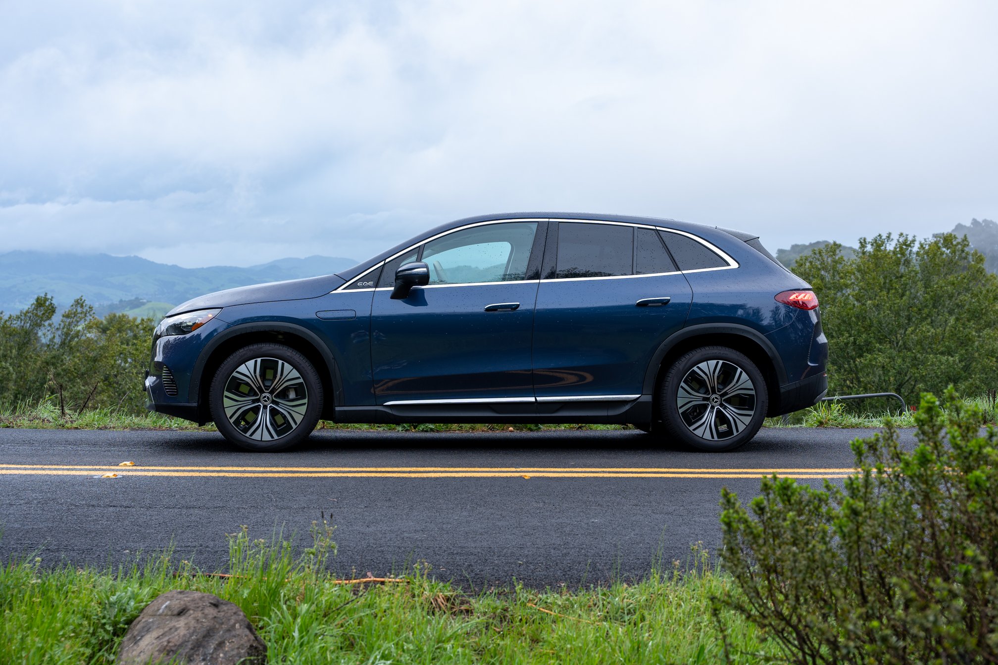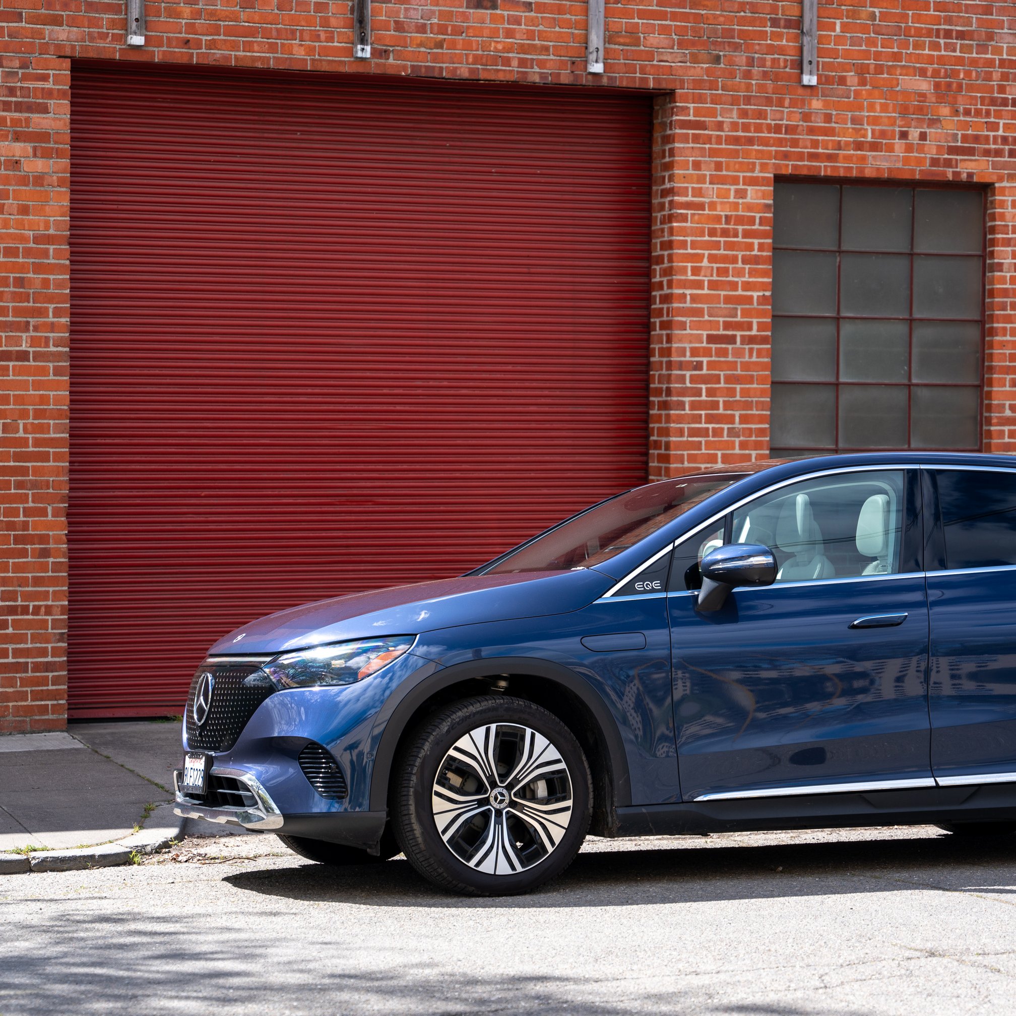 On Sunday afternoon, I take the EQE to Trader Joe’s for the weekly shop. Though the EQE is nine inches longer than my Tesla Model 3, the midsize SUV is more nimble at dodging shopping carts and slotting into parking spots, thanks to its 10 degrees of rear steer. (The rear steer is $450 well spent.) Mercedes’ high-resolution 360-degree parking cameras also make it easy to squeeze the SUV into tight spots; the backup camera overlays the EQE’s predicted path, and when the steering wheel is turned to its limit, the path is comically U-shaped. When reversing, a helpful rear-cross traffic alert warns me of cars coming across my rear.