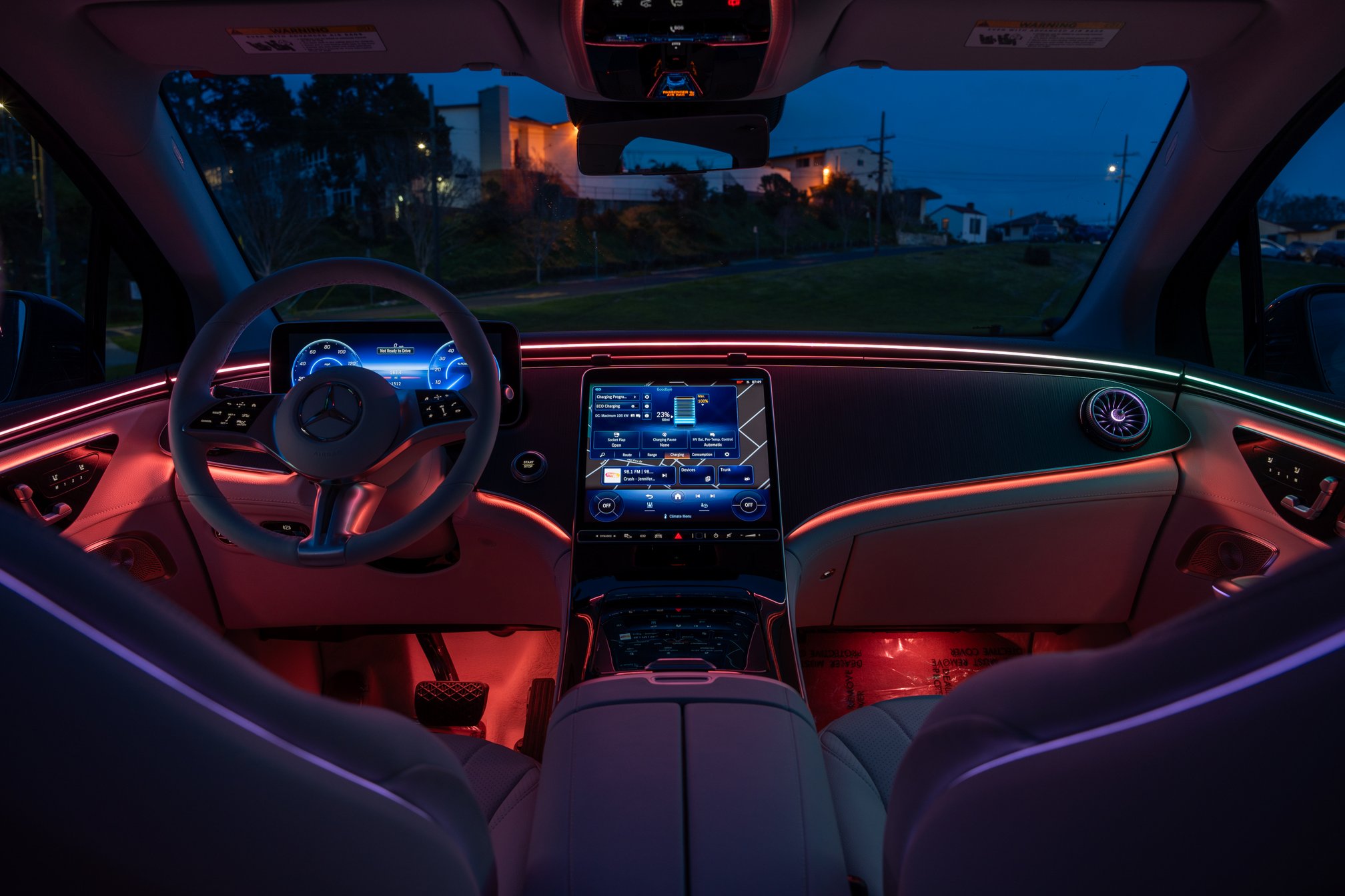 Even though my daughters struggle to open and close the hefty doors, they love the EQE’s airy interior, spacious back seat, wafting ride and Pink Floyd light show. I like all these things, too, but I wince at the dirt stains the little feet are making on the white carpet and seat backs.