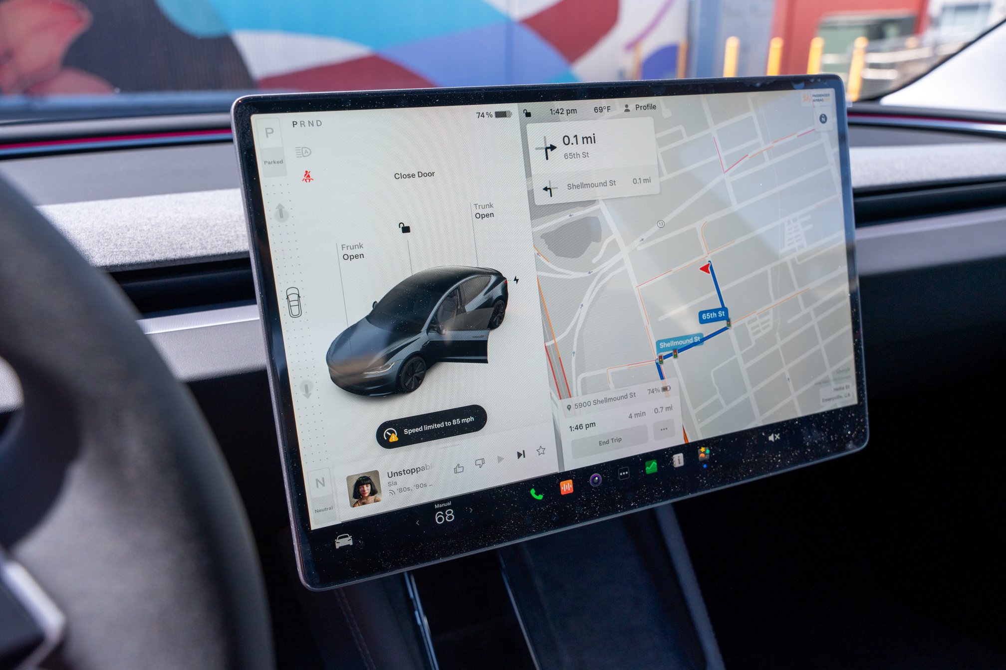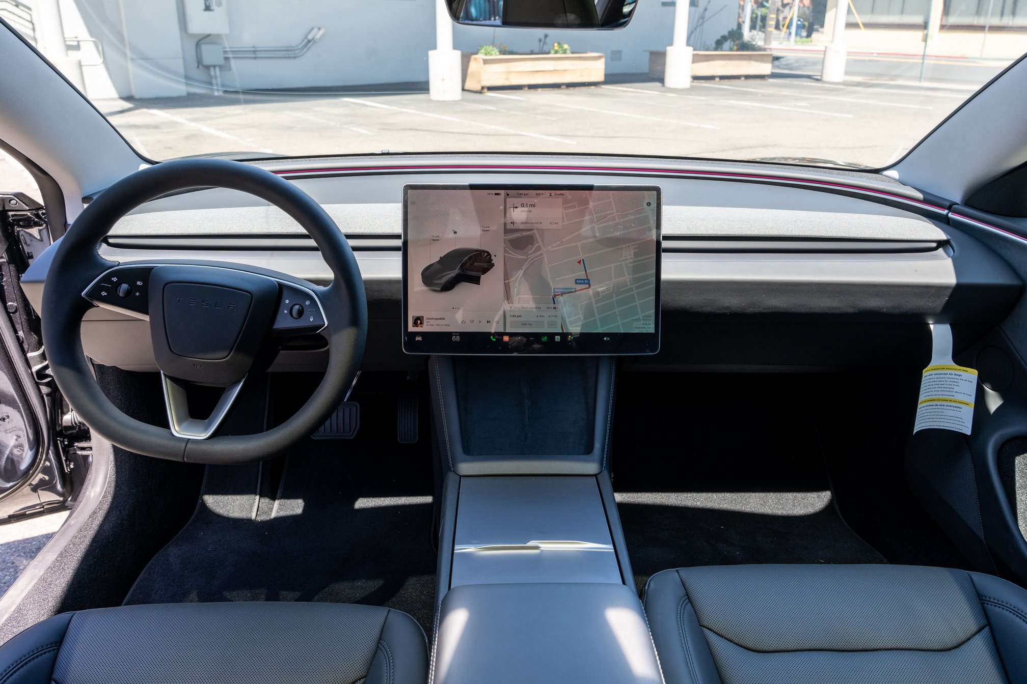 Right now, the 2024 Model 3 has a 75% charge and predicts a 249-mile range. Teslas tend to be optimistic with their range predictions—at least for my driving style. Doing the math, I realize the new car is underperforming its EPA-rated 341-mile range on a full charge, but it still handily outlasts our 2018 Model 3 Mid Range, which predicts about 240 miles range on a full charge or 180 miles on a 75% charge. Gripe #3 is sorted.
