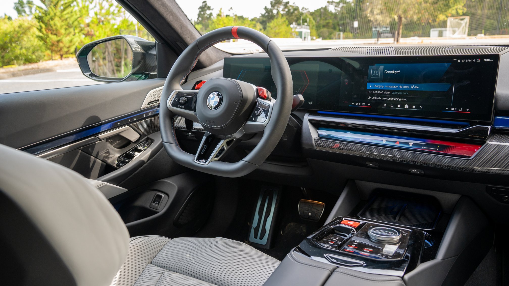 I’ve settled into the BMW M5’s extremely comfortable front seat and found its start button only to be startled by theatrical “bbbuuuwhaaahh” power-up noise.  The welcome noise gives me a flashback to the THX intro sounds from 2000’s movie theaters.  (Yes, the driver is now listening.)