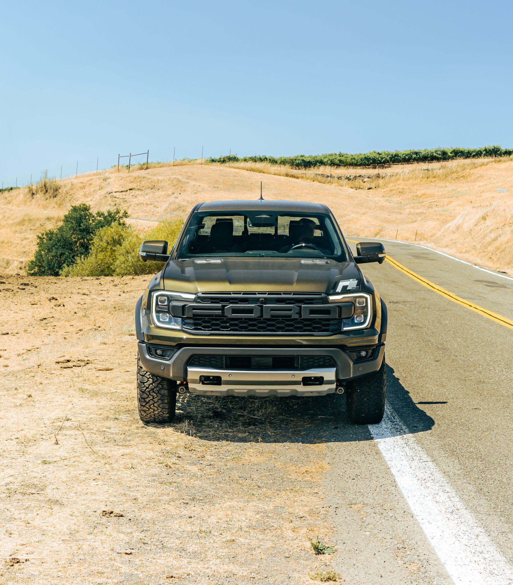 We leave the highway, and on a clear stretch of rural road that’s strung between the vineyards, Sage slows to 15 mph, then pounds the throttle to demonstrate the 455 horses in action. The V6 turbo engine moans gutturally like a pissed-off wookiee as we accelerate from second gear to sixth. The thrust is brisk, and the 10-speed’s short gearing has the Ranger Raptor rapidly clicking off upshifts. But ultimately, I’m left thinking that 455 hp doesn’t kick as hard when it’s pushing 5,325 lbs. (And admittedly, 0-60 mph in ~5.0 seconds feels slower at truck height than it does at sports car height.)