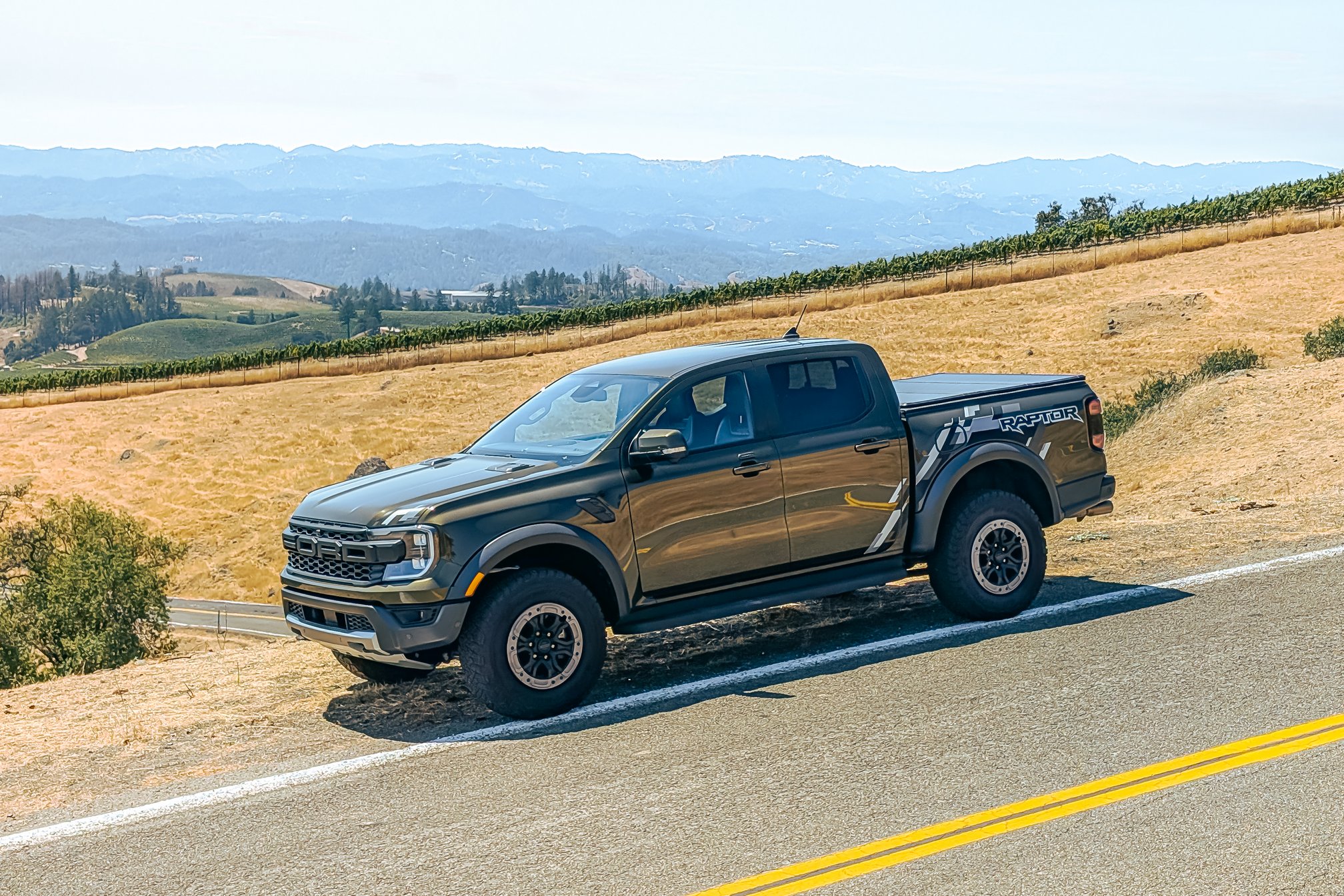 Admittedly, to test those performance-fettled features, we’d be pointing the Ranger Raptor at towering sand dunes or vast desert washes, but we don’t have either here in wine country. So, Sage sets a route to the nearest twisting road: We’ll test the Ranger Raptor’s chops by climbing out of the vines and up to the vistas.