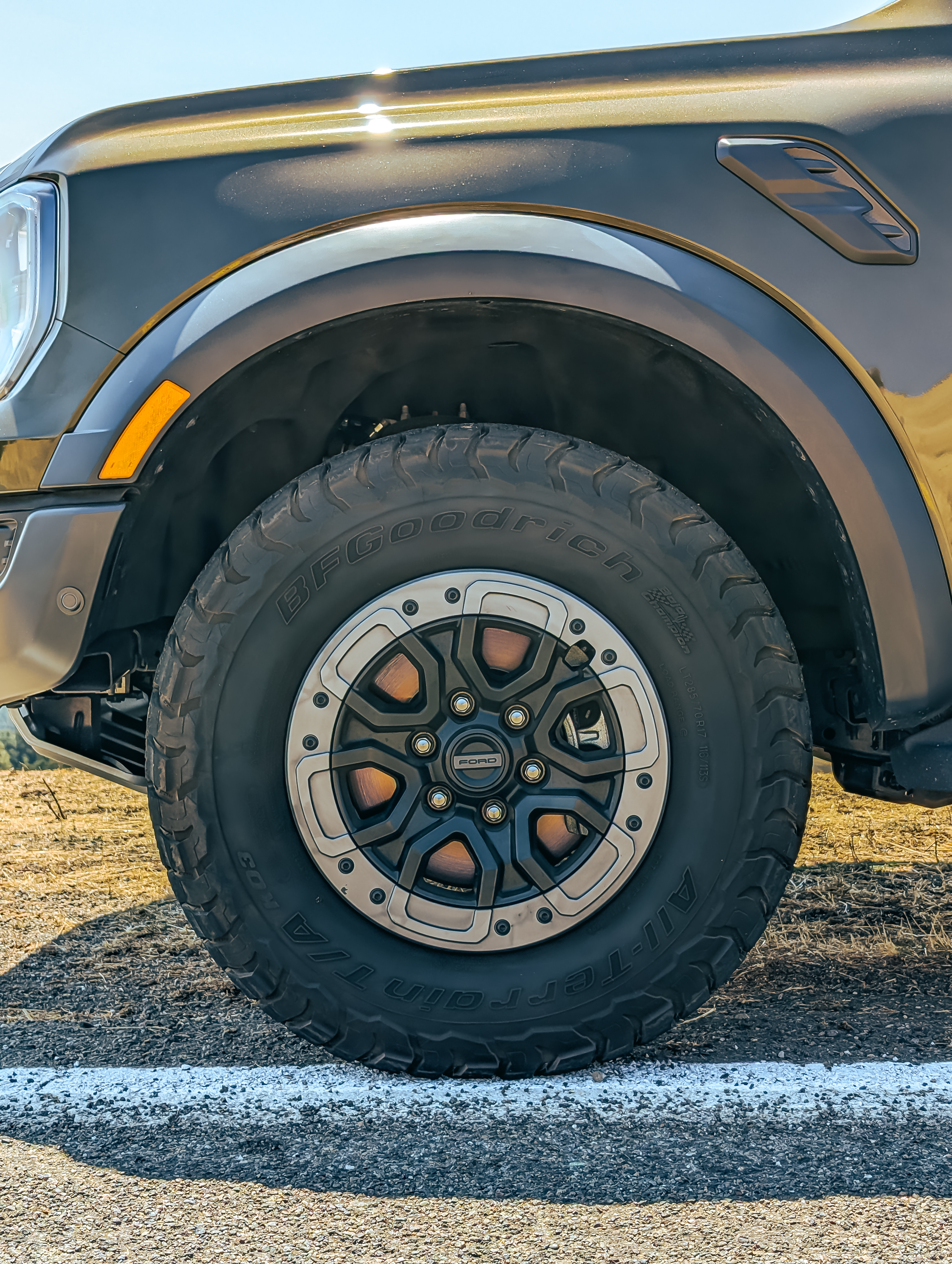 Even though I’m in two-wheel drive mode and brandishing 536 lb-ft of torque, the Ranger Raptor’s meaty 285/70R17 BFGoodrich All-Terrain T/A KO3 tires have all the grip I need to put down the twist.