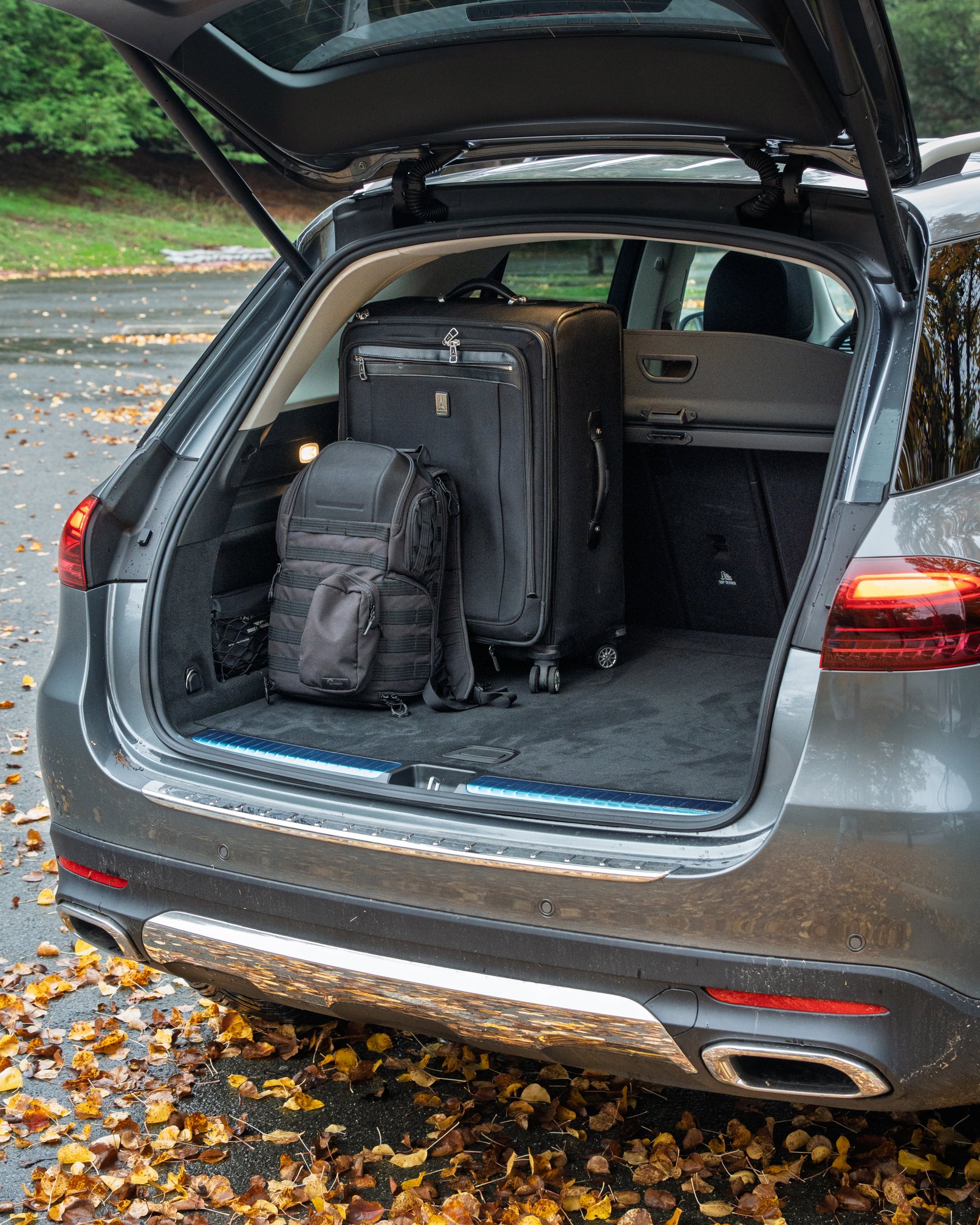 Our Christmas trip is overnight, but thanks to the GLE 350’s spacious trunk, we can be luxuriously undisciplined in our packing. We loosely stuff our clothing into a large 26-inch suitcase and a smaller 22-inch rollaboard. The suitcases, a Costco-sized box of presents, two backpacks, and several bags of groceries fit easily in the GLE 350’s hold.