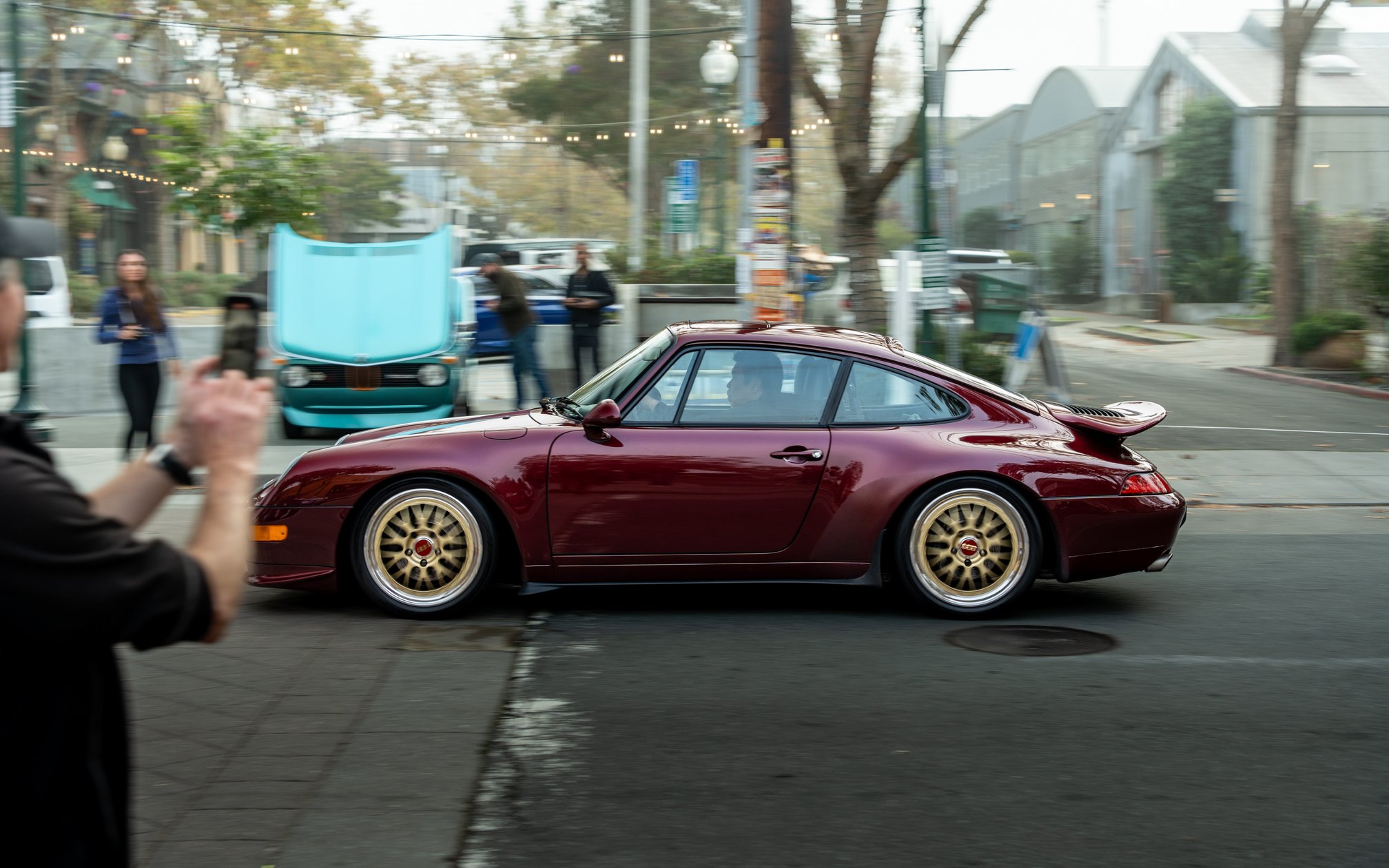I’m hoping to shoot more pictures of the 993 against a color-contrasting building in West Berkeley, but my backdrop of choice is blocked by trucks. Workers are unloading movie equipment into the warehouse, and a man in an LA Dodgers cap follows our slow roll down the block with a big smile on his face. The Arena red 993 elicits appreciative stares wherever it goes!
