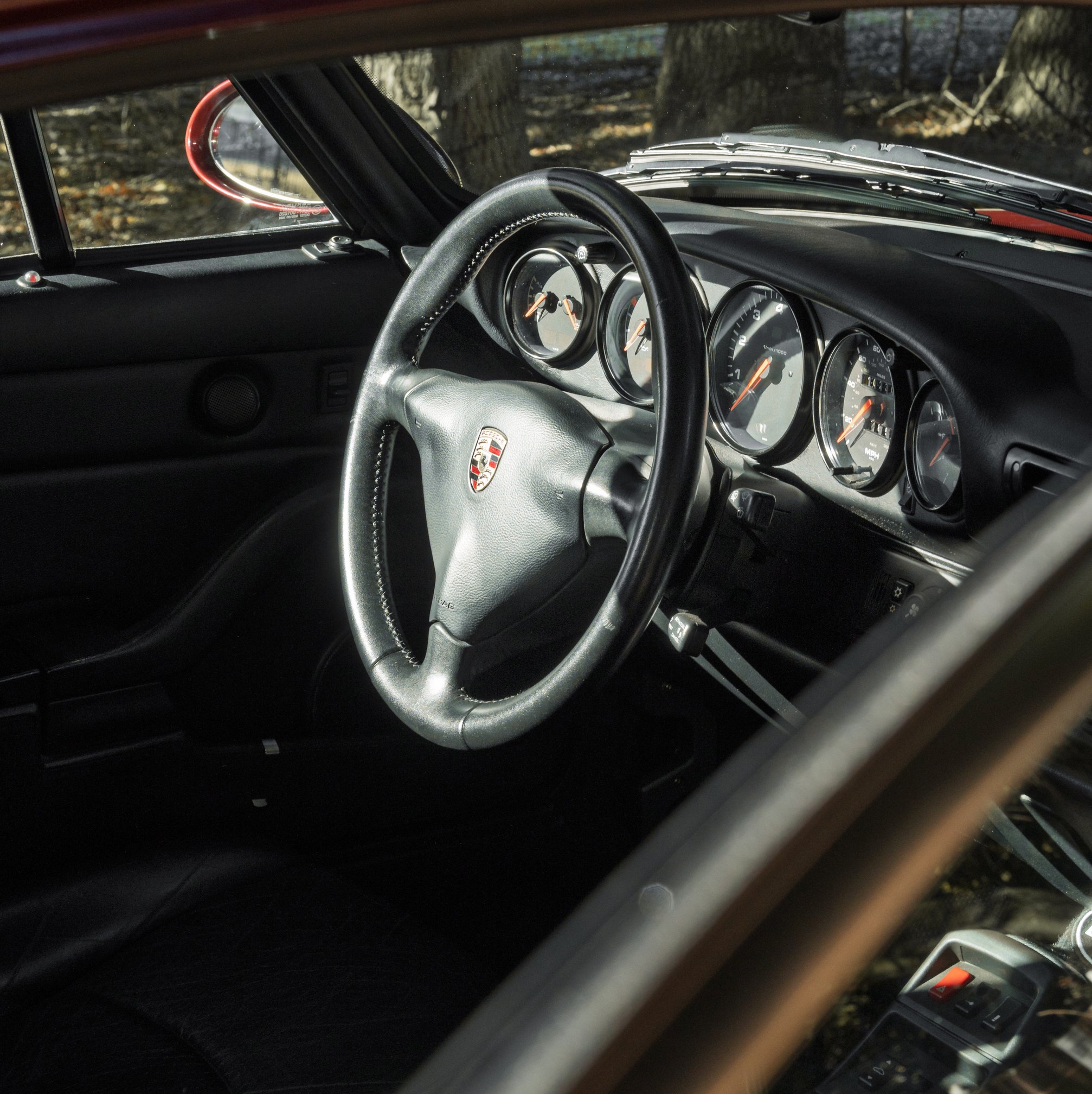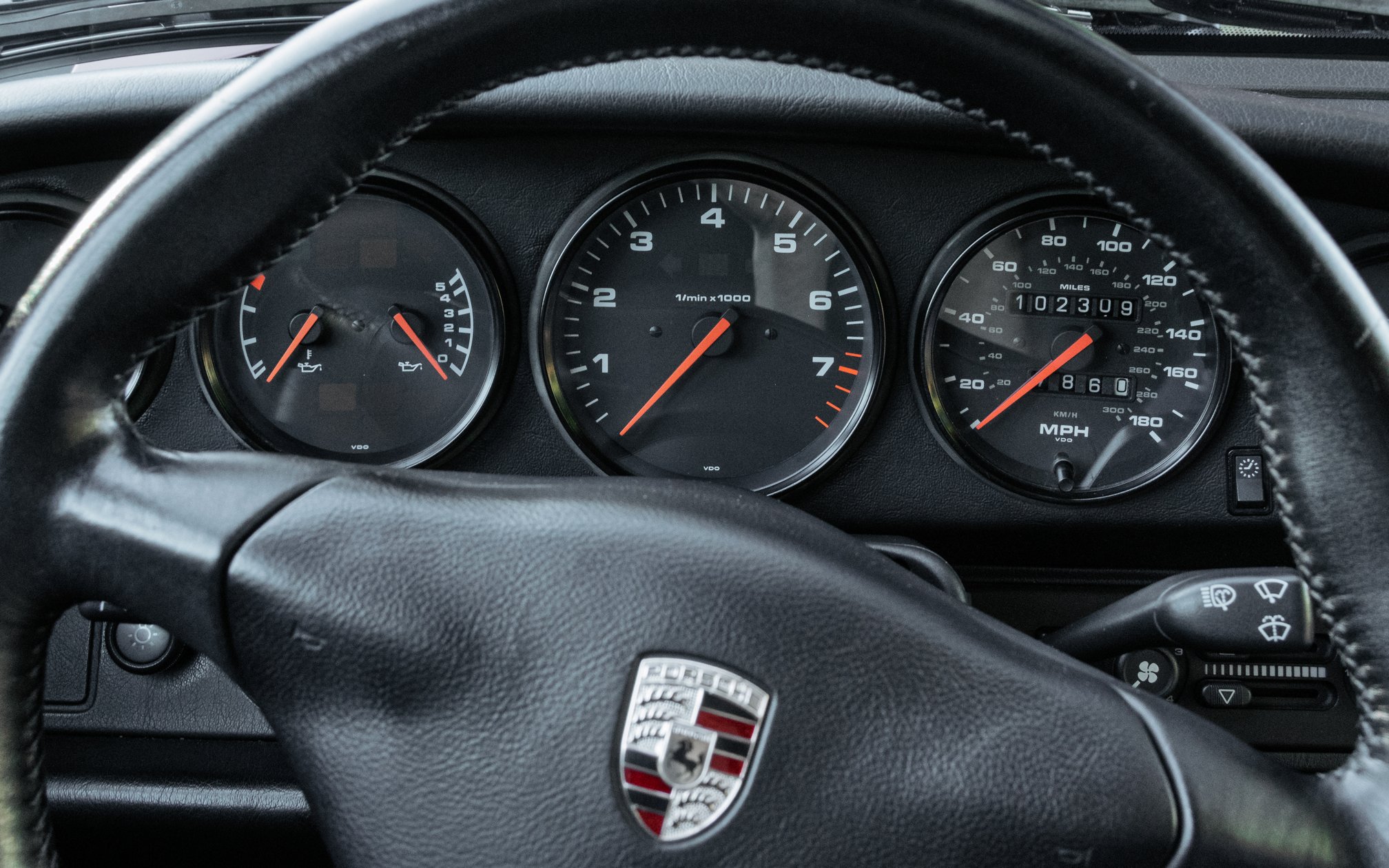 The tachometer’s orange needle is perfectly pointing up (at 4k rpm) when I stomp the gas. The needle sweeps right as we gather speed—the 993’s cabin is awash in beautiful noises of flying pistons, exploding gasoline, and whirring fans.