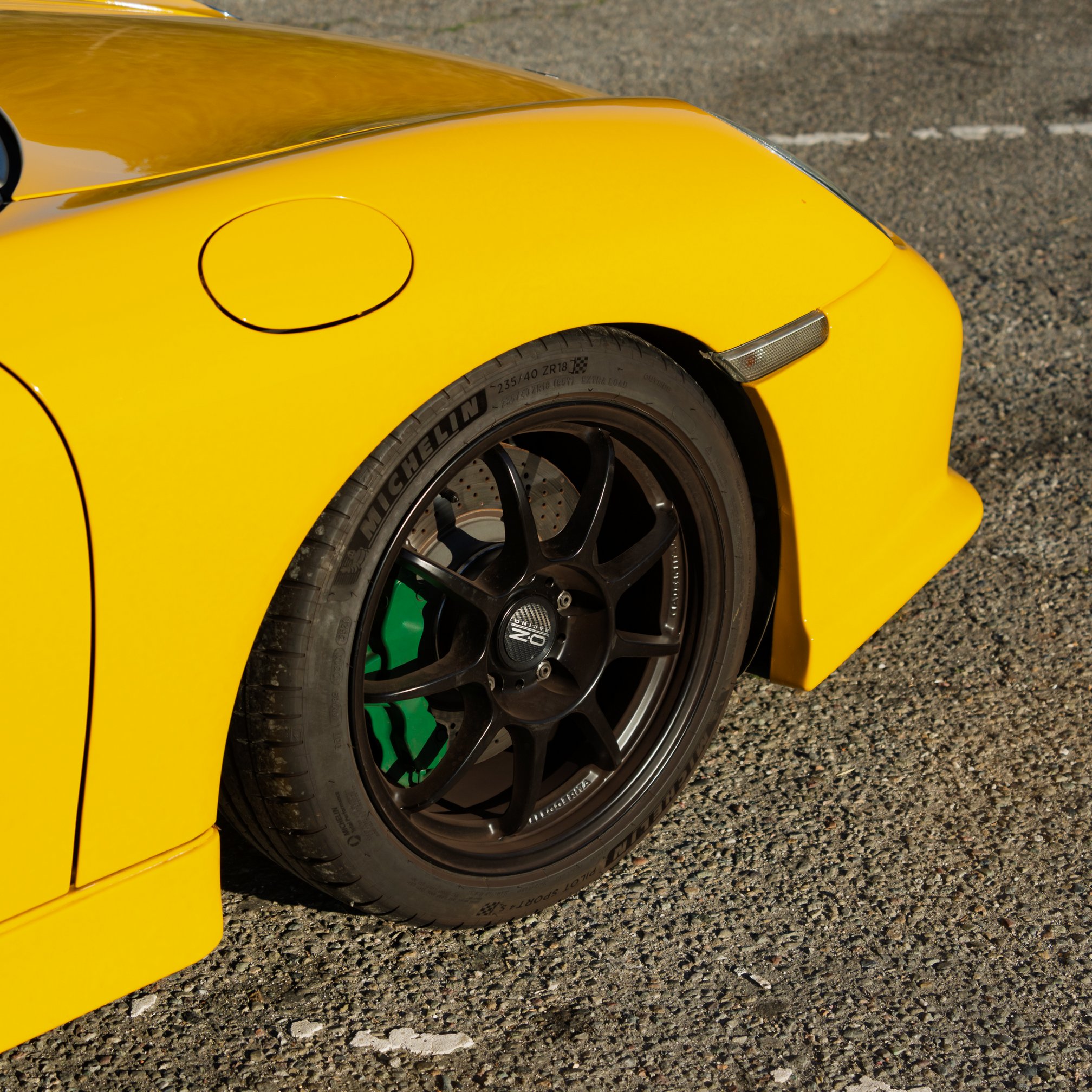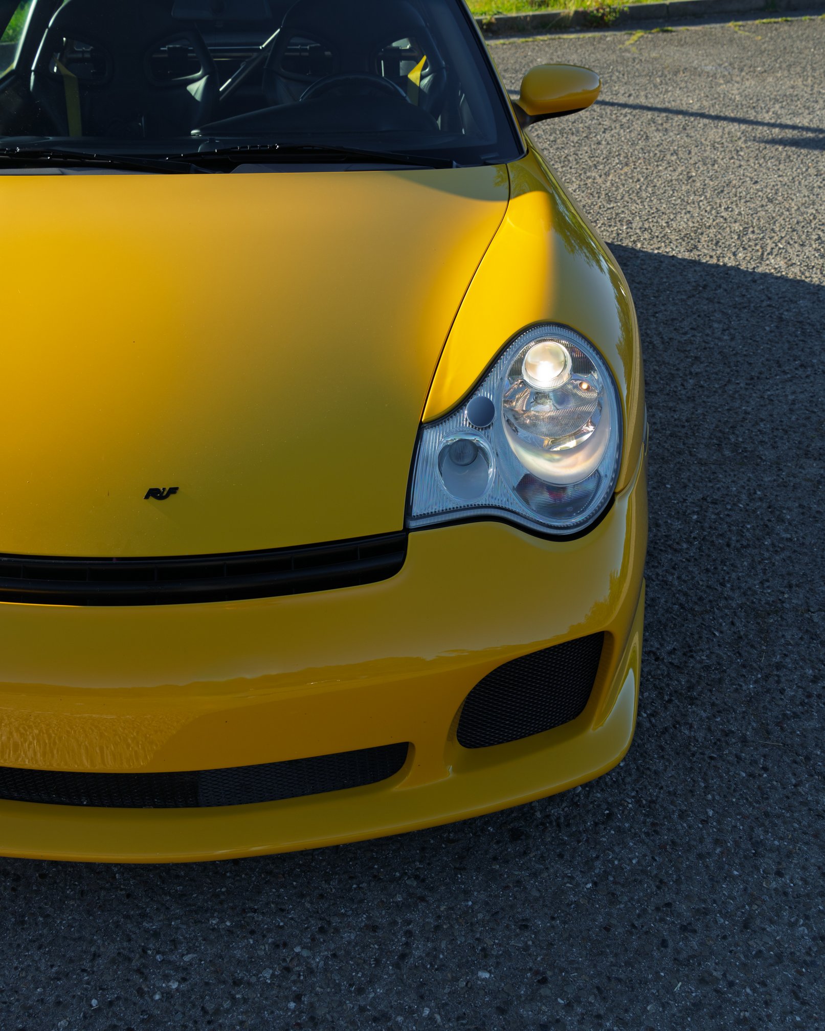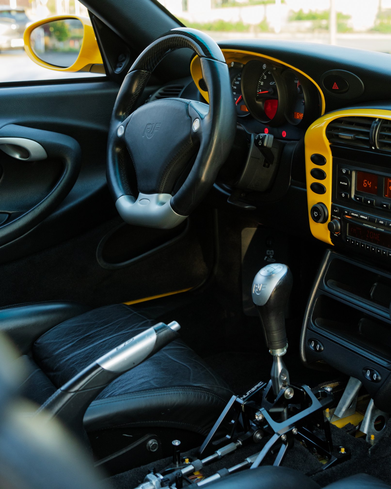 From the curb, the retinal-scorching yellow 996 GT3 appears highly modified, boasting an aggressive RUF body kit, RUF exhaust, RUF green calipers, and OZ Racing wheels. The shock and awe continue inside, as the Numeric shifter’s linkages have been left exposed. The rods and cables look as sinister as the original Terminator after its final, fiery bath.